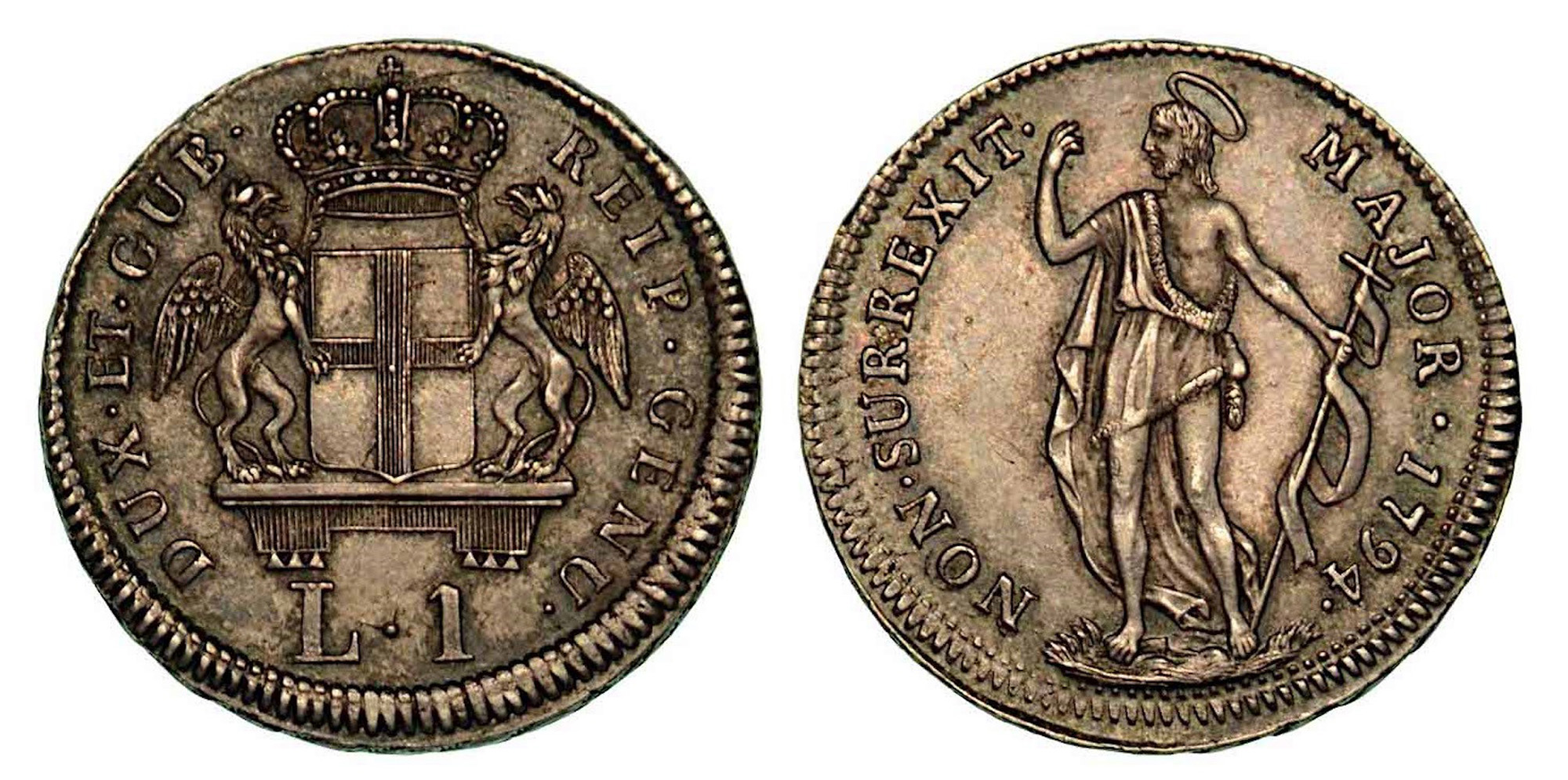 GENOVA. Dogi biennali, 1528-1797., Lira 1794. Stemma coronato sorretto da due grifoni; sotto, L 1. R/ San Giovanni stante in predicazione. CNI 8. Lunardi 353. MIR 316/1. Arg. g. 4,08. q.FDC