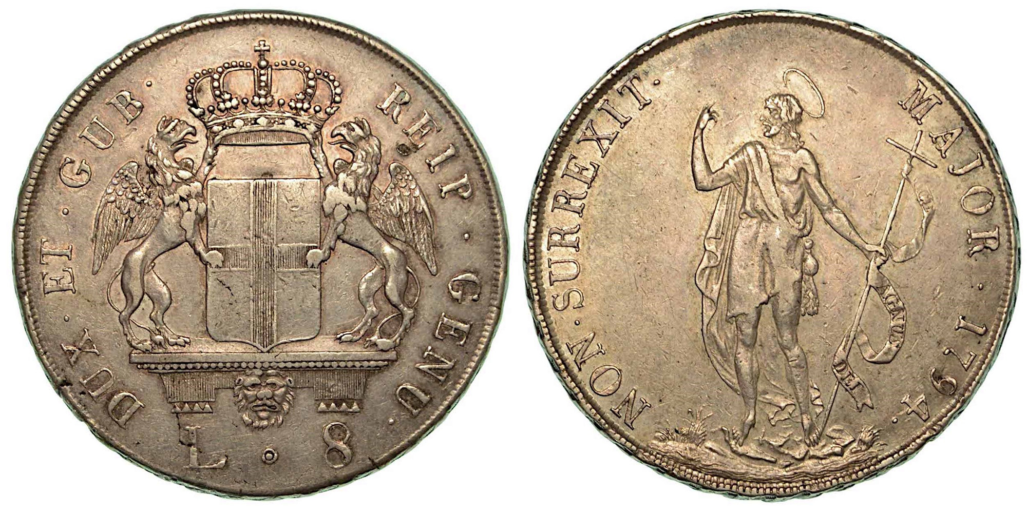 GENOVA. Dogi biennali, 1528-1797., Da 8 lire 1794. Stemma coronato sorretto da due grifoni, legato in basso da rami di palma e di alloro; sotto, L - 8. R/ San Giovanni stante in predicazione. CNI 3. Lunardi 364. MIR 309/2. Arg. g. 33,16. BB+