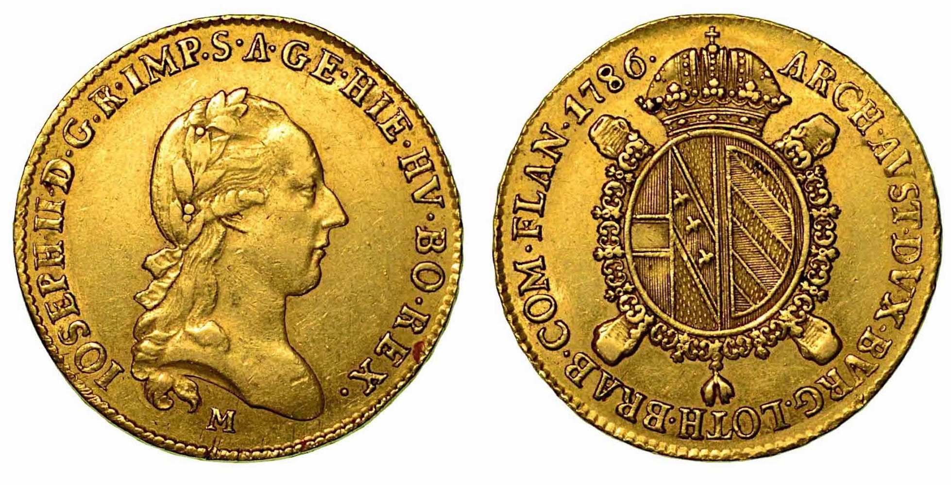 MILANO. Giuseppe II, 1780-1790., Monetazione di tipo imperiale - Sovrano 1786. Testa a d. laureata. R/ Stemma ovale d’Austria, sormontato da corona imperiale e sovrapposto a croce di Borgogna; intorno, il Collare del Toson d’oro. Crippa, 13/A. Oro. g. 11,08. BB/SPL