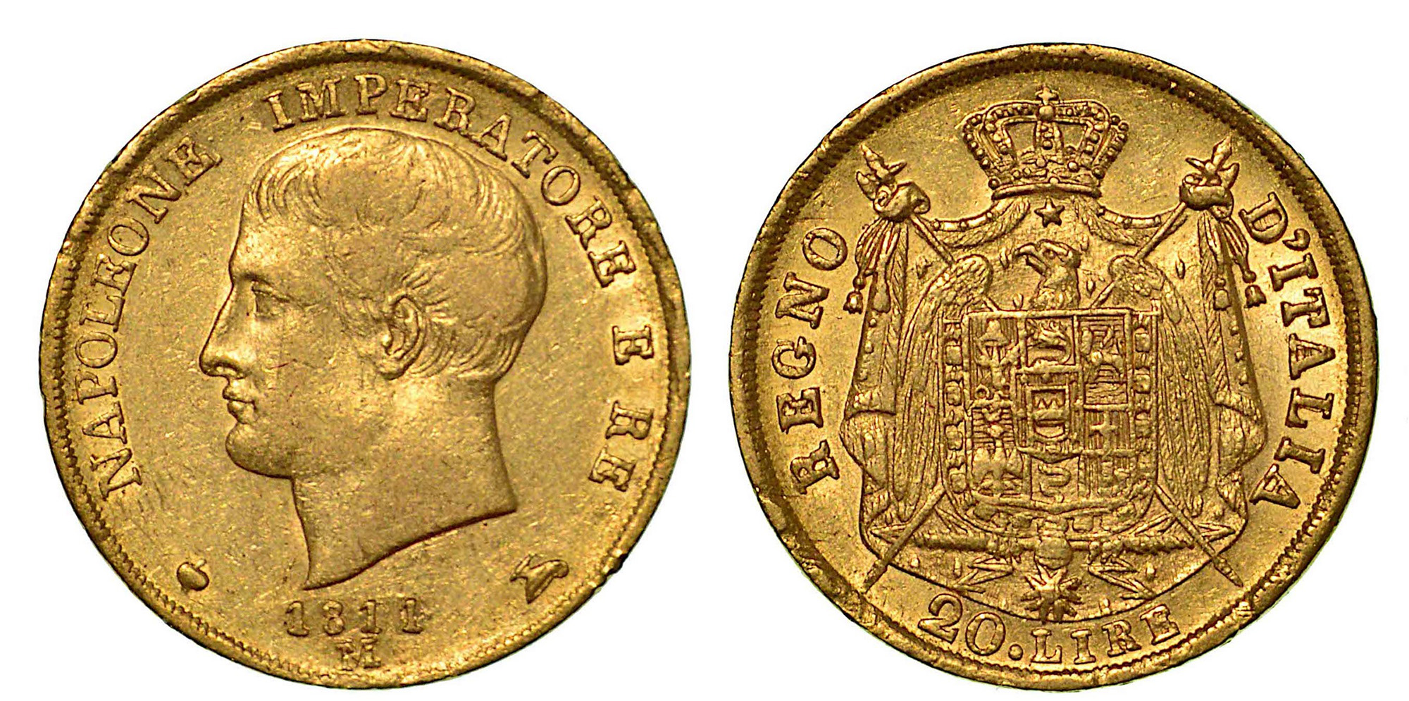 MILANO. Napoleone I, 1801-1815., 20 Lire 1811. Testa a s. R/ Stemma. Crippa 26/d. Gig. 87. Oro. g. 6,42. BB/q.SPL
