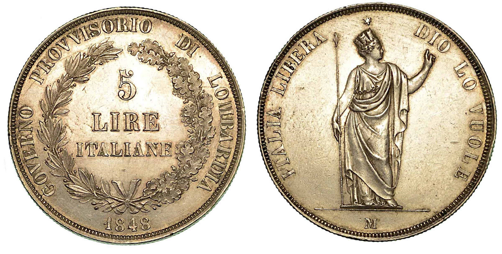 MILANO. Governo Provvisorio di Lombardia, 1848., 5 Lire 1848. Valore fra rami di alloro e di quercia. R/ Italia turrita in piedi tiene nella mano d. un'asta. Crippa 3/A. Gig. 3. Arg. g. 25,04. BB/q.SPL