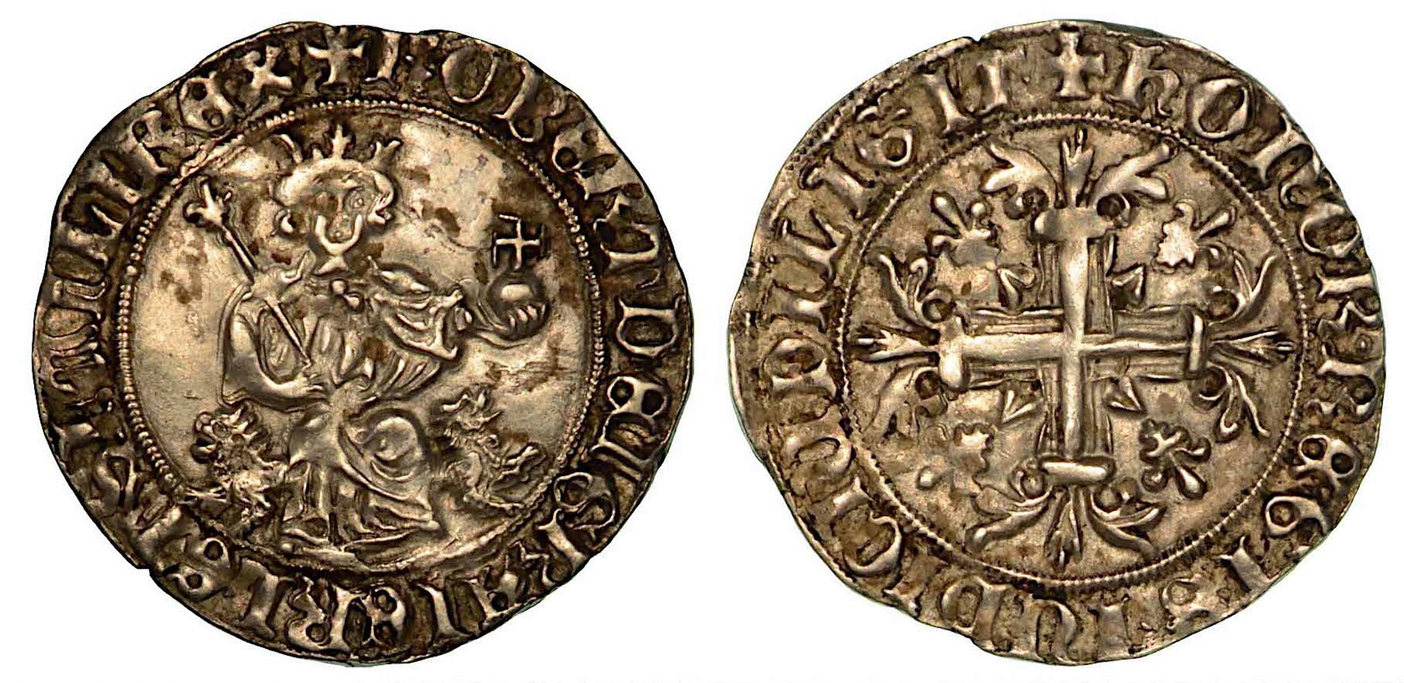 NAPOLI. Roberto d'Angiò, 1309-1343., Gigliato. Il re coronato, seduto di fronte fra due leoni, regge globo crucigero. R/ Croce gigliata cantonata da quattro gigli. MIR 28. P/R 1-2. Arg. g. 3,96. q.SPL