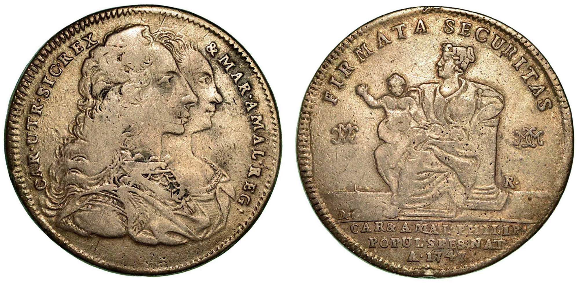 NAPOLI. Carlo di Borbone, 1734-1759., 120 Grana 1747. Busti accollati della coppia reale Carlo e Maria Amalia a d. R/ Figura femminile seduta con bambino. MIR 335/1 (variante con DeG in basso a s. al rovescio). P/R 28. Arg. g. 25,12. q.MB
