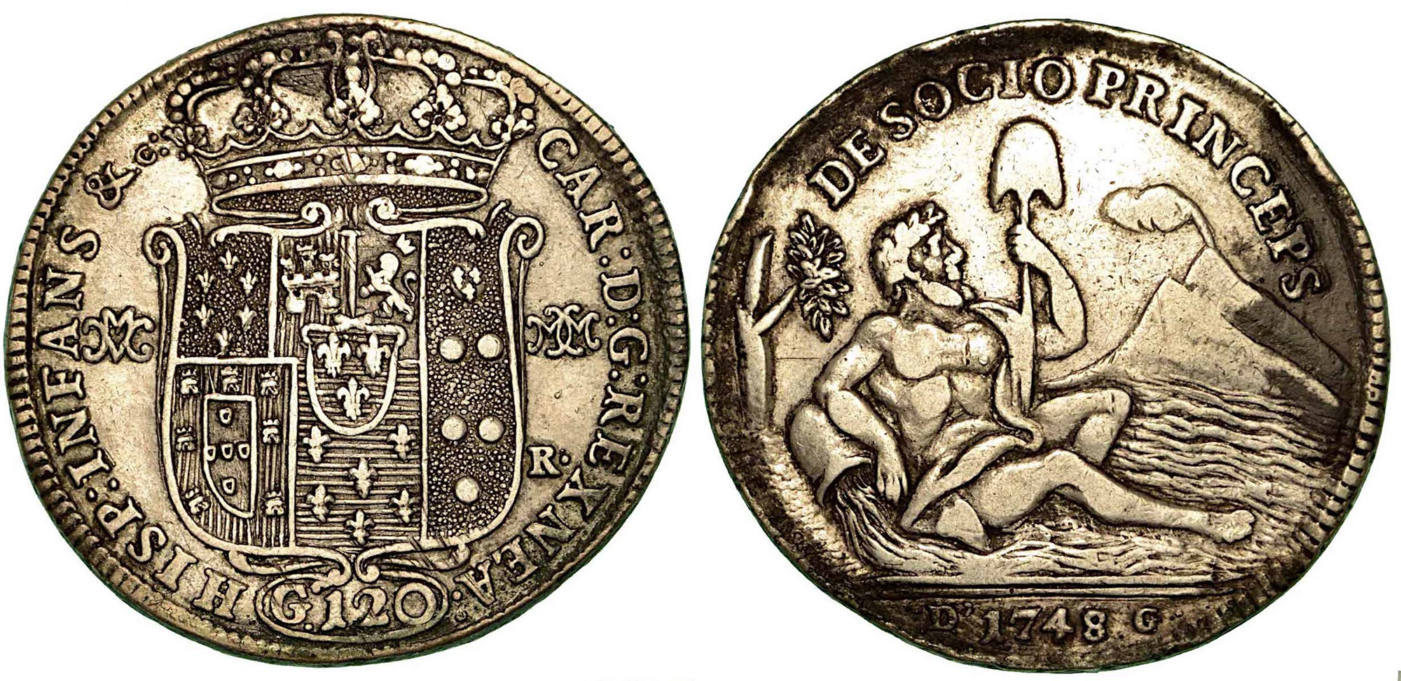 NAPOLI. Carlo di Borbone, 1734-1759., 120 Grana 1748. Stemma coronato. R/ Il Sebeto sdraiato; sullo sfondo il Vesuvio fumante. MIR 336. P/R 26. Arg. g. 25,15. MB/q.BB