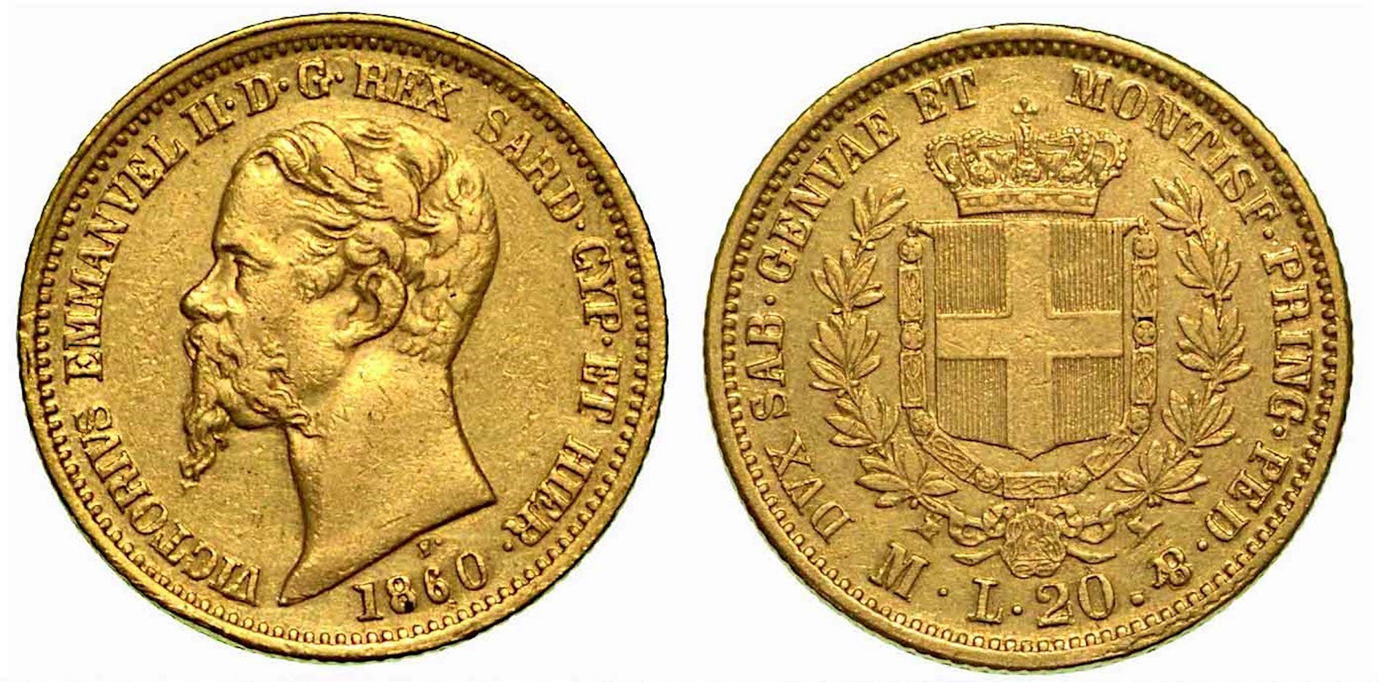 REGNO DI SARDEGNA. Vittorio Emanuele II di Savoia, re eletto 1849-1861., 20 Lire 1860, zecca di Milano. Testa a s. R/ Stemma sabaudo. Gig. 20. Oro. g. 6,41. BB/SPL