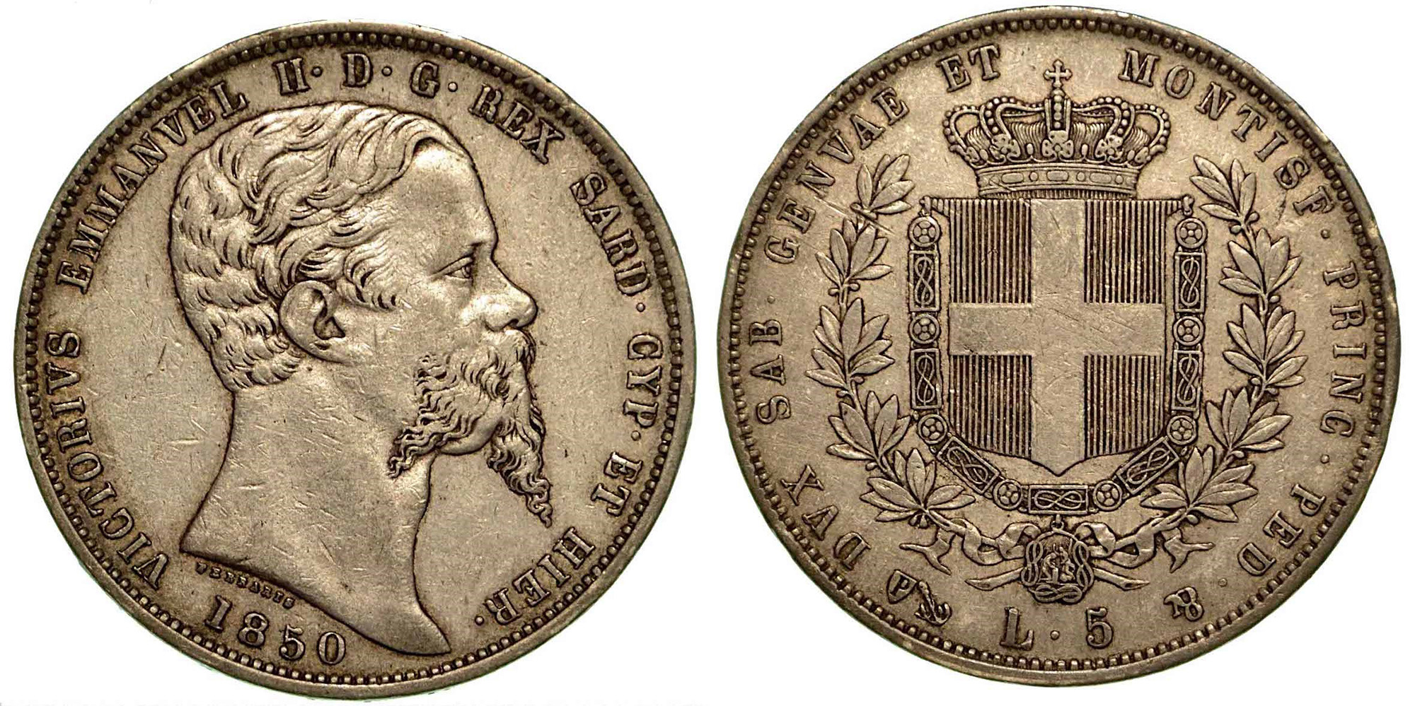 REGNO DI SARDEGNA. Vittorio Emanuele II di Savoia, 1849-1861., 5 Lire 1850, zecca di Genova.