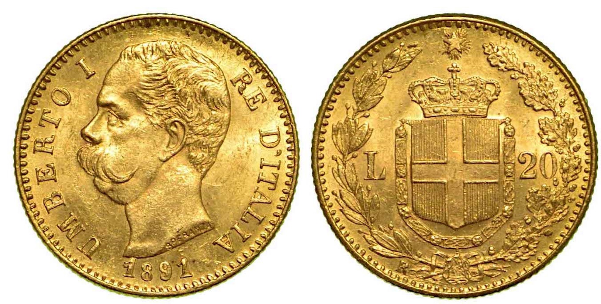 REGNO D'ITALIA. Umberto I di Savoia, 1878-1900., 20 Lire 1891 (con cifre 1 ribattute).