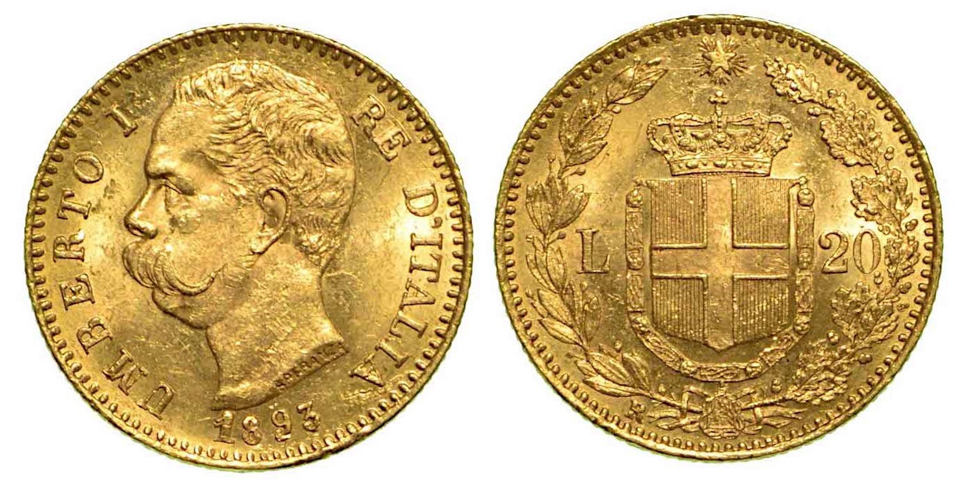REGNO D'ITALIA. Umberto I di Savoia, 1878-1900., 20 Lire 1893 (con 1 ribattuto). Testa a s. R/ Stemma. Gig. 21 (vedi nota). Oro. g. 6,44. SPL/FDC