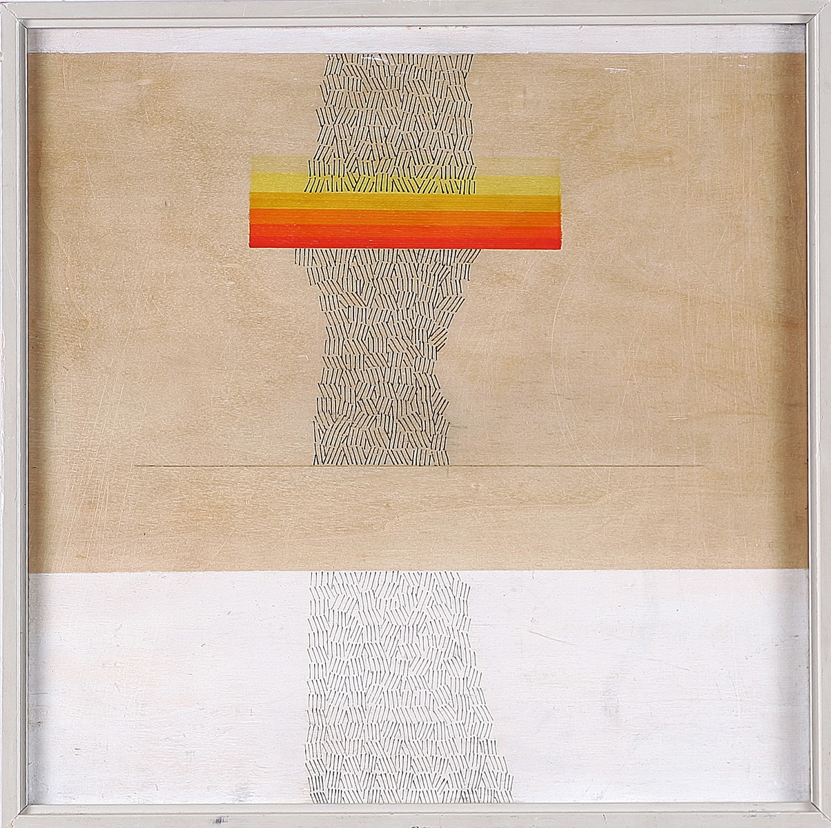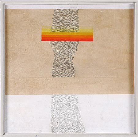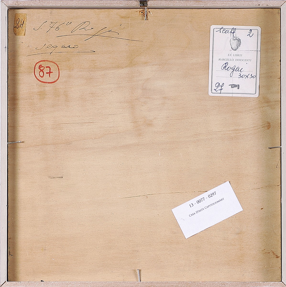 ROGAI MAURIZIO (n. 1954) S.76. Tecnica mista su tavola. Cm 30,00 x 30,00. Titolo e firma al retro. Cornice presente