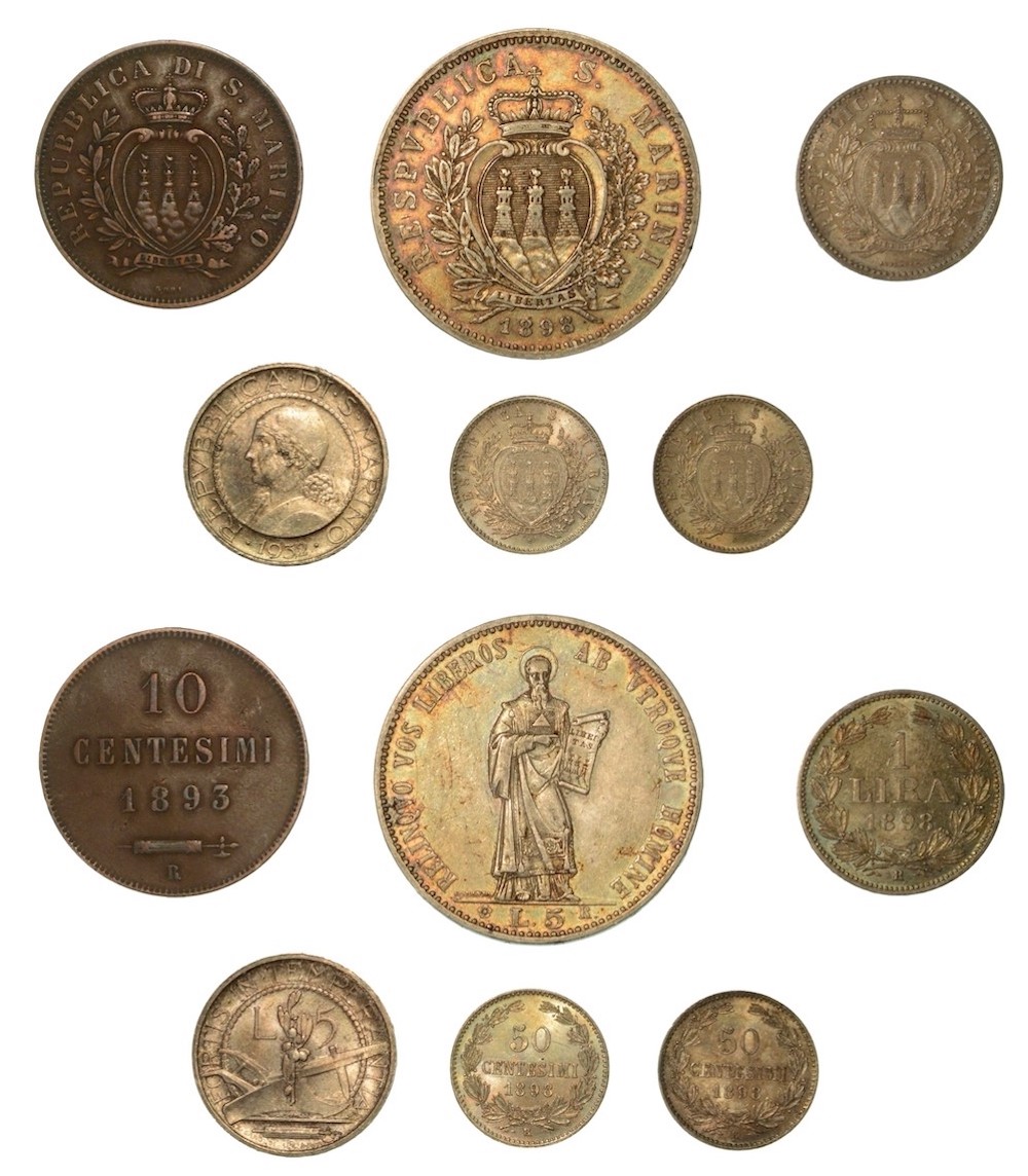 SAN MARINO. Lotto di sei monete., 5 Lire 1898 (q.SPL-bella patina iridescente) - 1932. 1 Lira 1898 (q.FDC-deliziosa patina iridescente). 50 Centesimi 1898 (x 2 esemplari) (SPL-bella patina iridescente; SPL-bella patina iridescente, graffio). 10 Centesimi 1893 (BB).