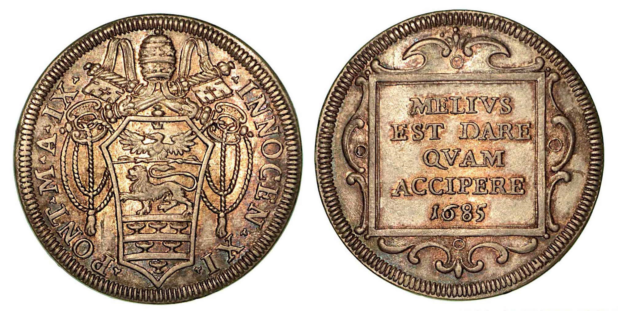 STATO PONTIFICIO. Innocenzo XI, 1676-1689., Testone 1689/a.IX. Stemma sormontato da chiavi e triregno. R/ Legenda "Melivs est dare qvam accipere 1685" entro cartella quadrata con ornati. CNI 5. Munt. 95. Arg. g. 9,15. SPL