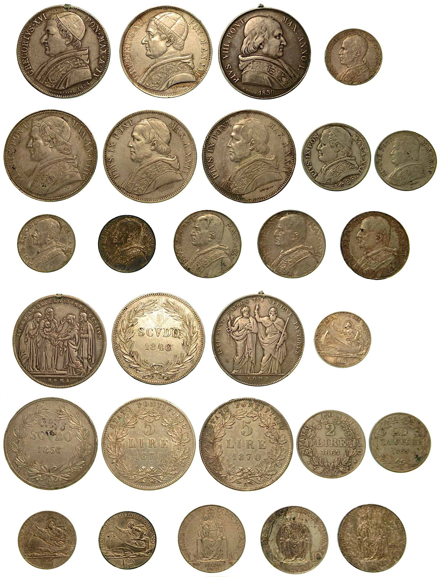 STATO PONTIFICIO. Lotto di quattordici monete., Pio XII, 1939-1958. 5 Lire 1939. Pio XI, 1922-1939. 10 Lire (x 3 esemplari) 1931 - 1932 -1933/34. 5 Lire (x 2 esemplari) 1930 - 1930. Pio IX, 1846-1878. 5 Lire (x 2 esemplari) 1870 - 1870. Scudo 1853. 2 Lire 1867. 20 Baiocchi 1861. Pio VIII, 1829-1830. Scudo 1830 (MB-appiccagnolo rimosso). Gregorio XVI, 1831-1846. Scudo 1834 (MB-appiccagnolo rimosso). Scudo 1846 (BB-brutti graffi al rovescio). Conservazioni da MB/BB a BB.