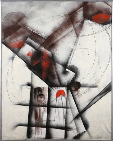 SANTORO GIUSI (n. 1931) Senza titolo. 1973. Tecnica mista su tela. Cm 81,00 x 100,00. Firma e data in basso a destra. Cornice presente