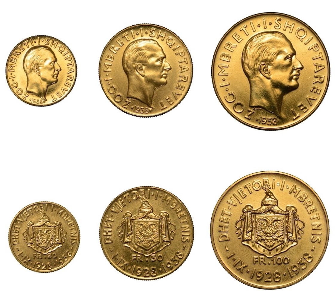 ALBANIA. Lotto di tre monete d'oro (titolo 900)., Zog I, 1928-1939. 20 Franga 1938 (riconio). g. 6,50 - 50 Franga 1938 (riconio). g. 16,16 - 100 Franga 1938 (riconio). g. 32,25. FDC
