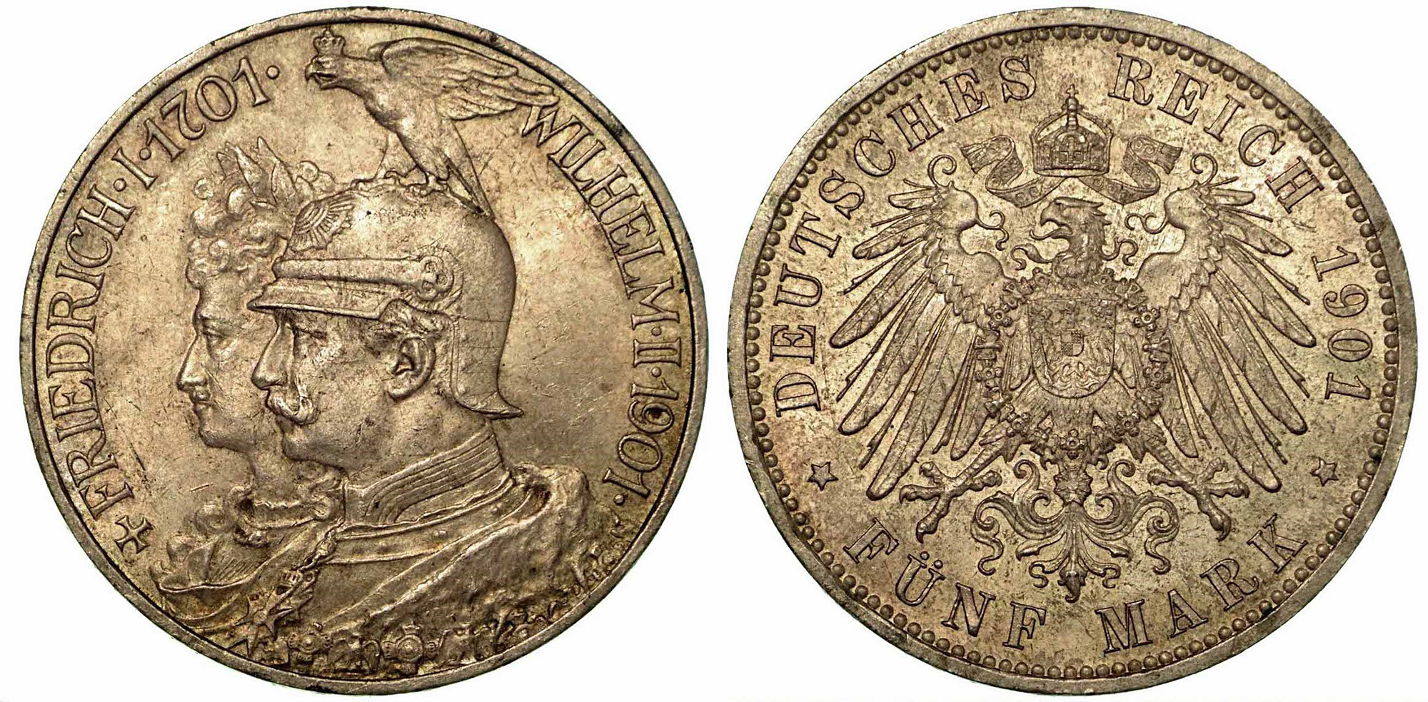 GERMANIA - PRUSSIA. Wilhelm II, 1888-1918., 5 Mark 1901 (200° anniversario della Prussia). Teste di Friedrich e Wilhelm a s. R/ Aquila coronata. KM# 526. Arg. g. 27,79. q.SPL