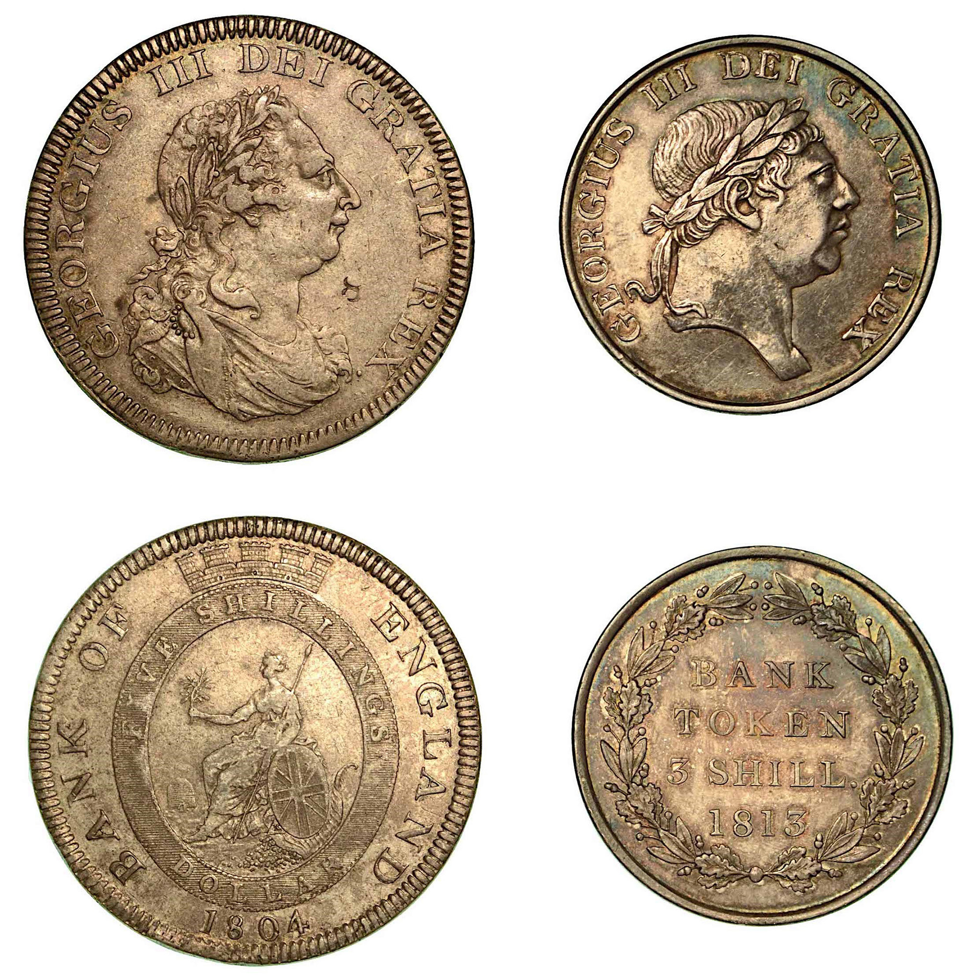 GRAN BRETAGNA. Lotto di due monete., George III, 1760-1820. 5 Shillings-Dollar, 1804 (q.BB). 3 Shilling, 1813 (BB). KM# Tn1-Tn5-680.2.