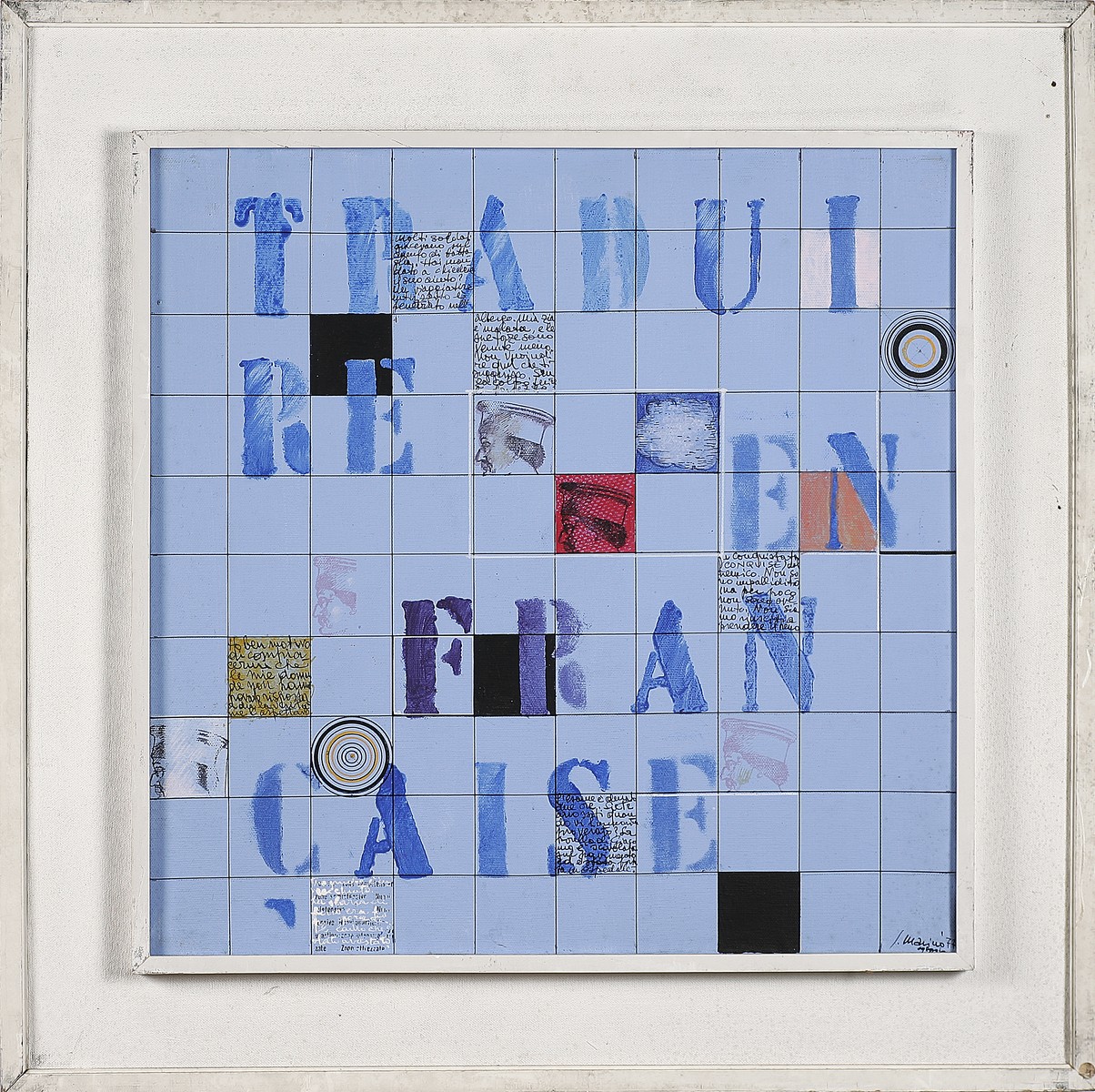 ANONIMO Traduire en francaise. 1977. Tecnica mista su tela. Cm 50,00 x 50,00. Firma e anno in basso a destra. Cornice presente