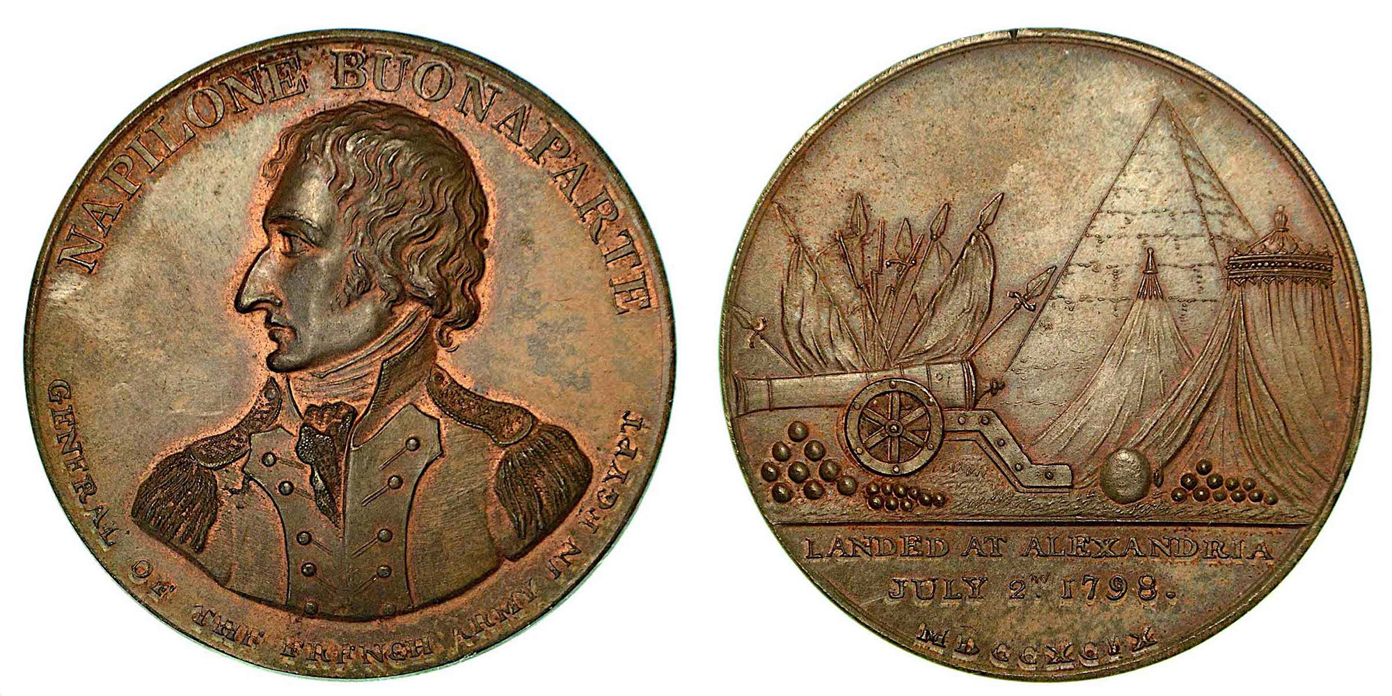 SBARCO AD ALESSANDRIA DI NAPOLEONE., Medaglia in bronzo 1799, Londra. Busto a s. in uniforme da generale, ritratto caricaturale ed eccessivamente pronunciato, sotto al busto GENERAL OF THE FRENCH ARMY IN EGYPT. R/ A s. cannone con palle, dietro insegne e bandiere; a d. tende beduine, sullo sfondo la grande piramide; in esergo, LANDED AT ALEXANDRIA/ JULY•2•1798•/ MDCCXCIX. Opus W. Wyon Hennin 847. Julius 620. Essling 751. Bramb. p. 35. diam. mm. 38,5. SPL/FDC