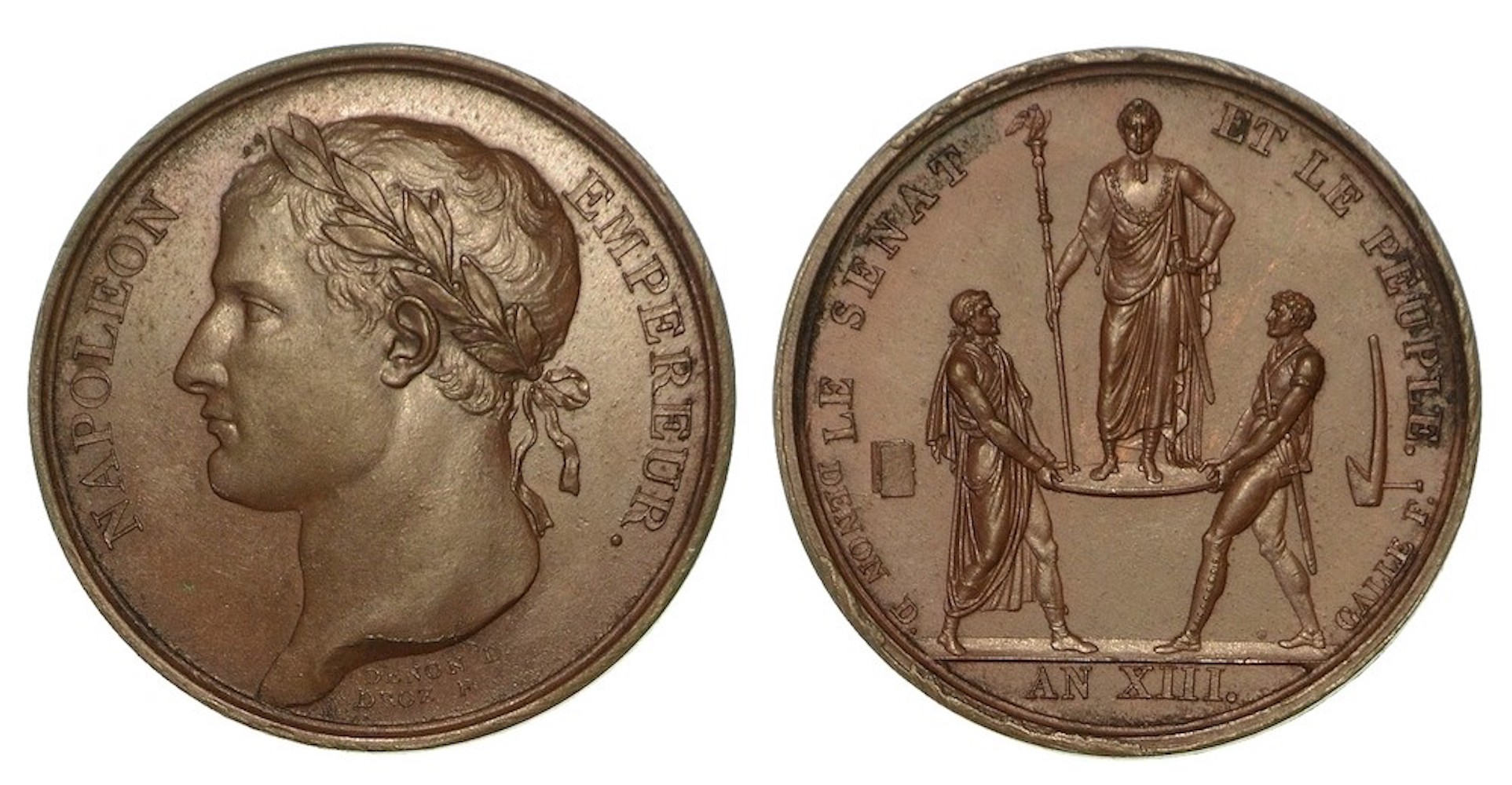 INCORONAZIONE DI NAPOLEONE A PARIGI., Medaglia in bronzo anno XIII (1804). Busto laureato a s. R/ Due uomini, un magistrato rappresentante il Senato e un soldato rappresentante il Popolo, sorreggono uno scudo sul quale è ritto l’imperatore con un’asta di comando in mano. Dietro il Senato, un libro; dietro il Popolo, un aratro. Julius 1260. Essling 1021. Bramsen 326. diam. mm. 25,9. SPL