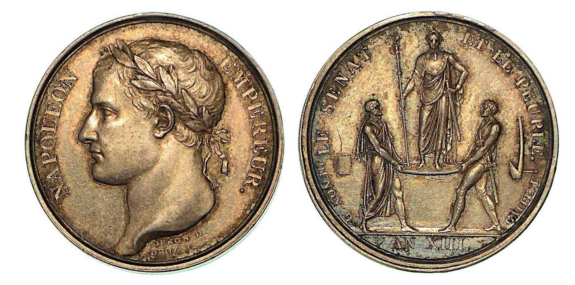 INCORONAZIONE DI NAPOLEONE A PARIGI., Medaglia in argento 1804. Testa laureata a s.. R/ Napoleone su scudo sostenuto da due soldati, ai lati libro aperto e aratro; in esergo, AN XIII. Opus Andrieu & Jeuffroy. Bramsen 326. Julius 1266. diam. mm. 26,1. q.SPL