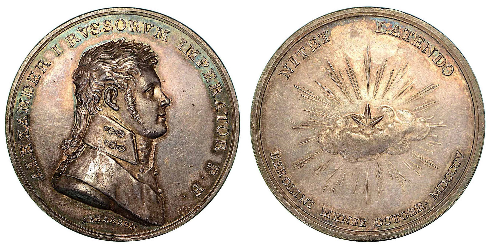 ALESSANDRO I IMPERATORE DI RUSSIA (1801-1825) VISITA BERLINO., Medaglia in argento 1805. Busto di Alessandro I a d. R/ Astro raggiante spunta da una nuvola. Opus A. Abramson. Diakov# 299.1. Julius 1432. Bramsen 2198. Essling 1098. diam mm. 40,5. q.FDC