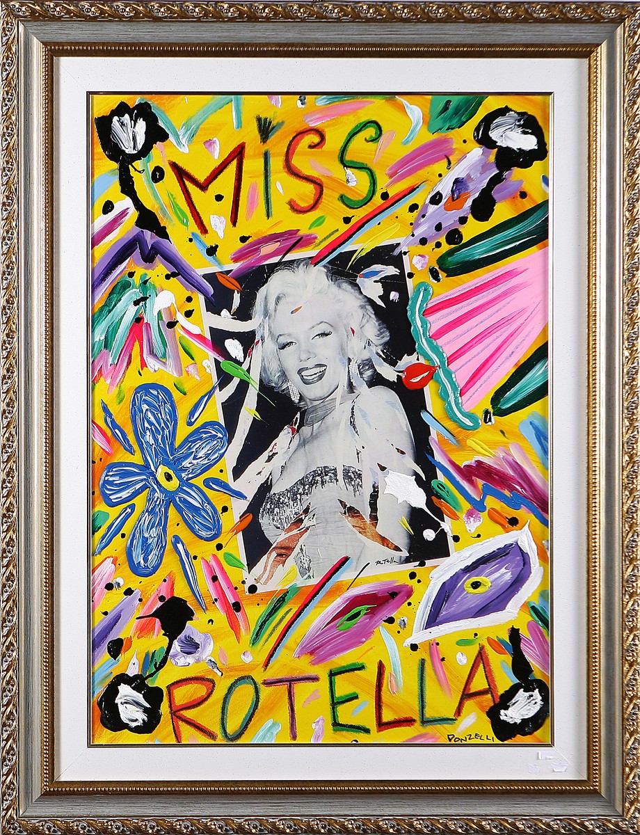 DONZELLI BRUNO (n. 1941) Miss Rotella. Tecnica mista su tela. Cm 50,00 x 70,00. Firma in basso a destra. Al retro firma e titolo. Autentica dell'artista su fotografia. Cornice presente