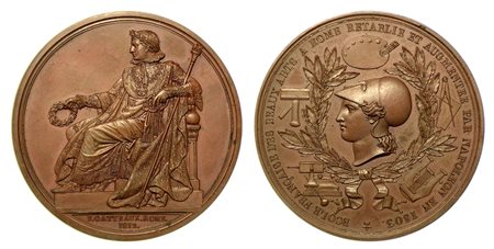 SCUOLA FRANCESE DELLE BELLE ARTI A ROMA., Medaglia in bronzo 1812. Napoleone seduto su trono, volto a s., con manto imperiale, corona di alloro e scettro. R/ Testa di Minerva entro di rami d'alloro legati alla base, all'esterno dei rami, torchio, martello, tavolozza, etc. Opus Gatteaux. Bramsen 1178. Julius 2558. Essling 2569. Turr. 835. diam. mm. 60. SPL