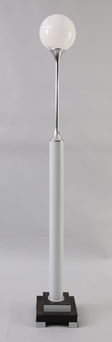 Lampada da terra a base quadrata con fusto cilindrico verniciato in grigio e paralume in vetro. Alt. cm172