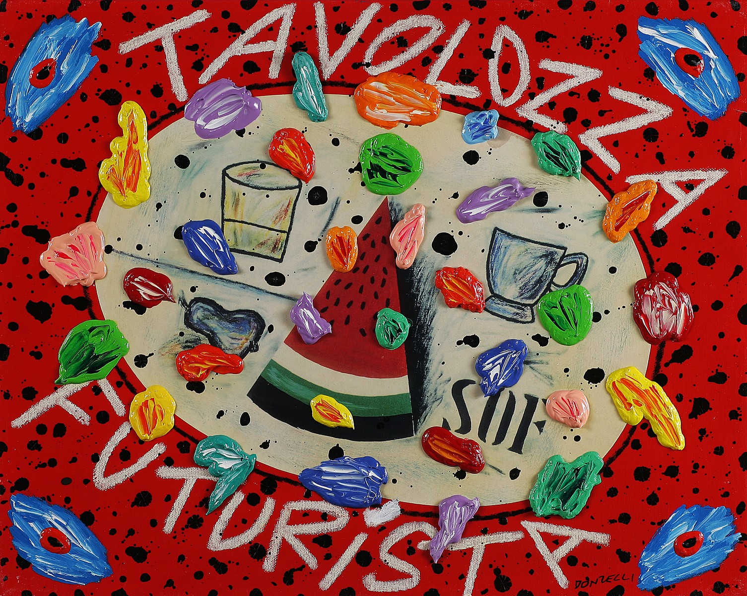DONZELLI BRUNO (n. 1941) Tavolozza futurista. Tecnica mista su tela. Cm 50,00...
