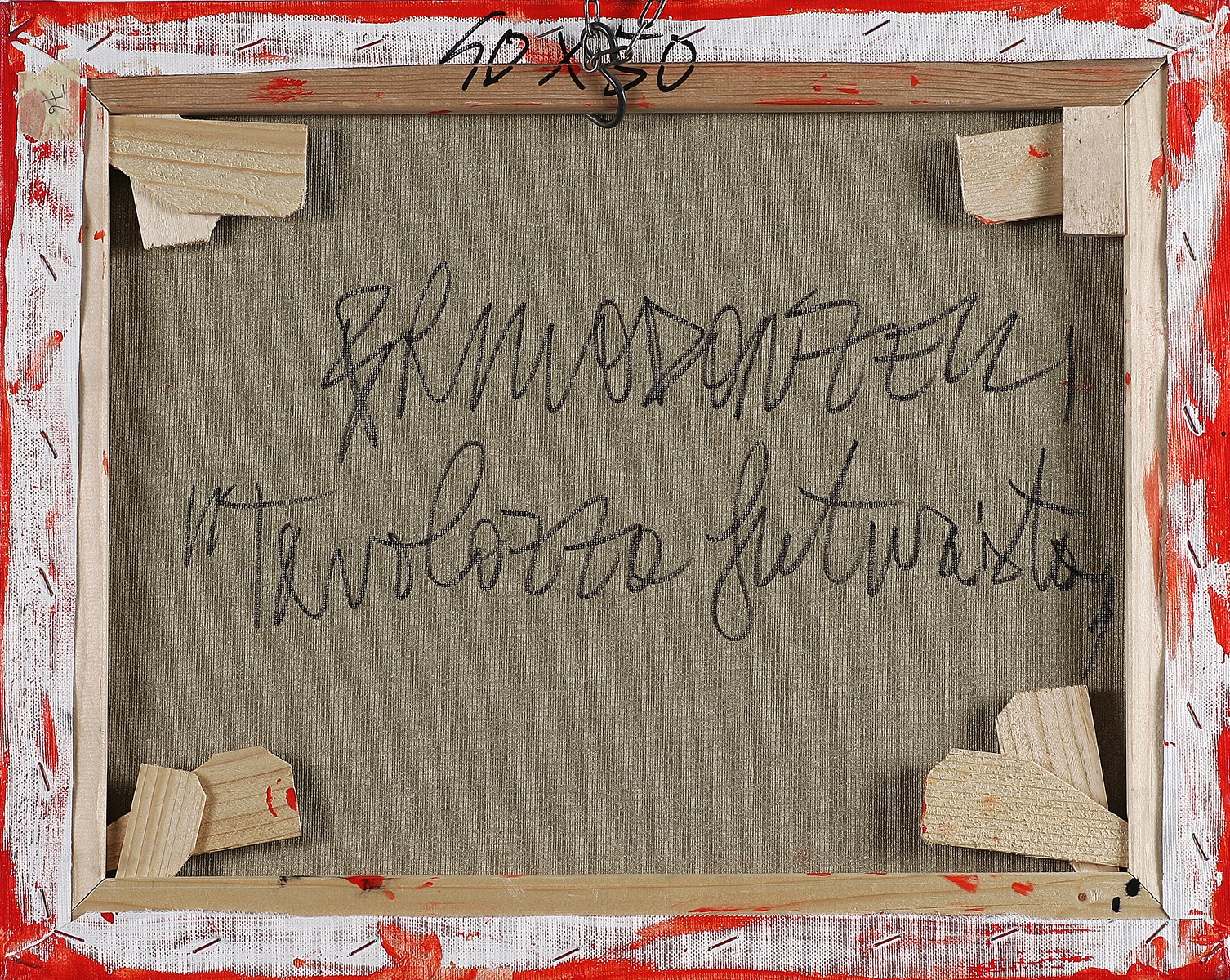 DONZELLI BRUNO (n. 1941) Tavolozza futurista. Tecnica mista su tela. Cm 50,00 x 40,00 x 2,00. Al retro titolo e firma. Firma in basso a destra. Autentica dell'artista su fotografia.