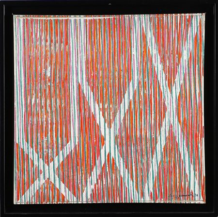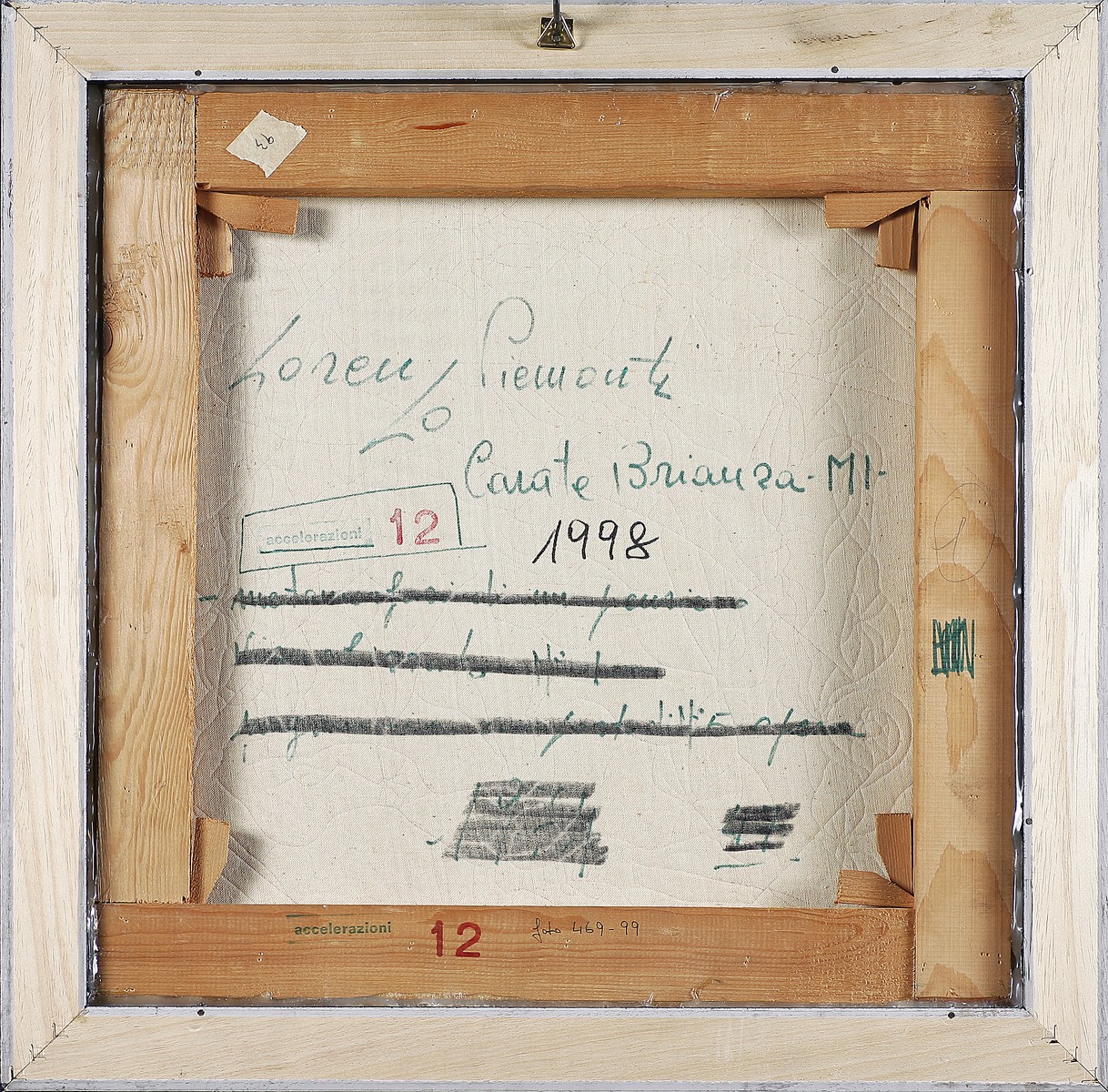 PIEMONTI LORENZO (n. 1935) Accelerazioni. 1998. Olio su tela . Cm 48,50 x 48,50. Al retro firma, data e titolo. Firma e data in basso a destra. Cornice presente