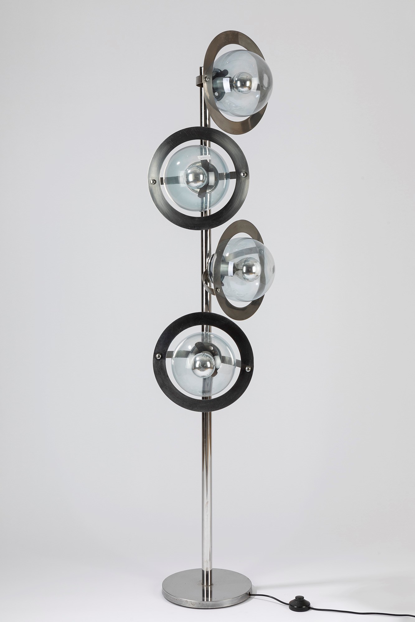 Manifattura Italiana - Lampada da terradm cm 30, H cm 160 in metallo cromato con stelo ed anelli che sostengono diffusori sferici in vetro.