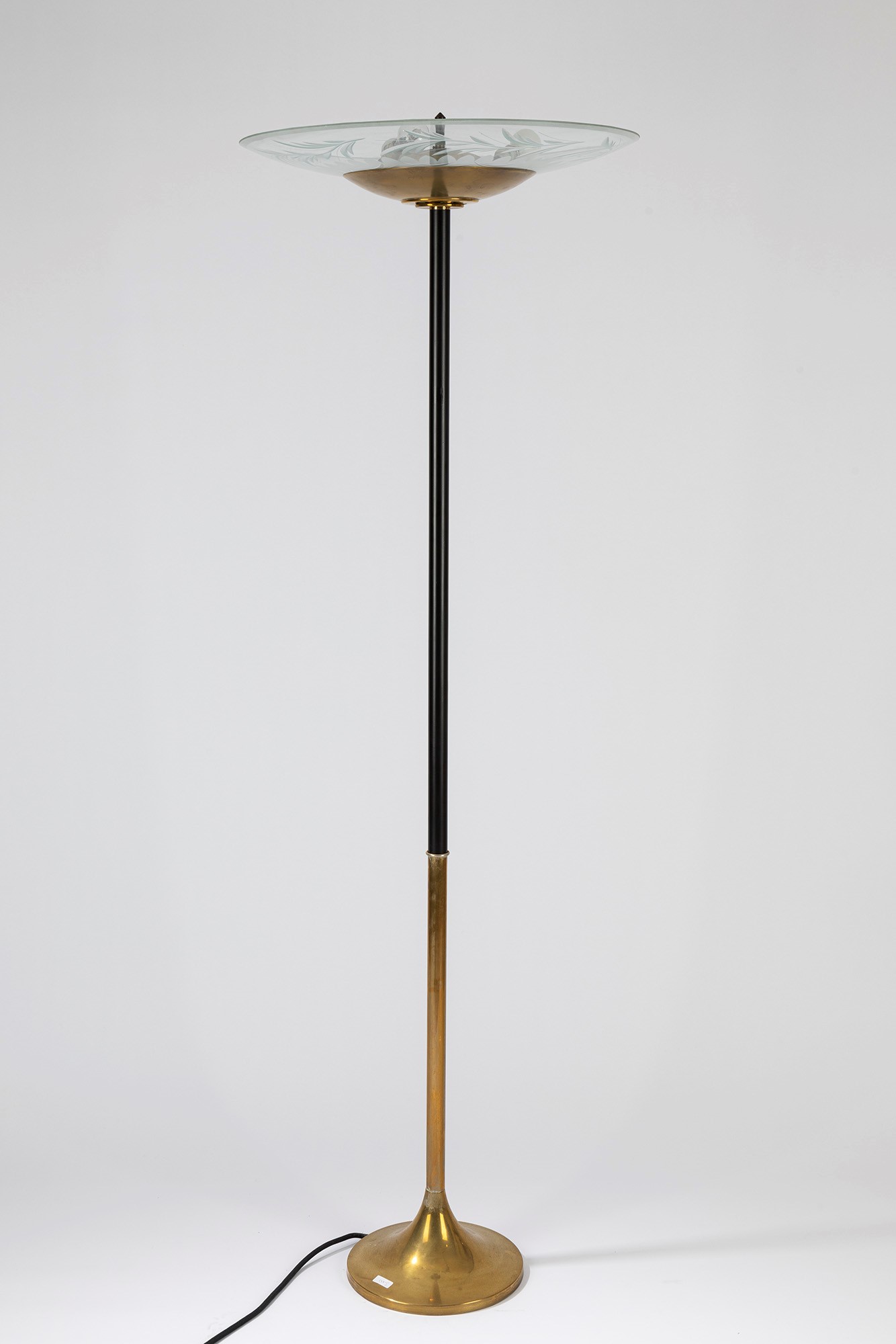 Manifattura Italiana - Lampada da terradm cm 57, H cm 175 in metallo laccato nero ed ottone, diffusore in vetro molato.