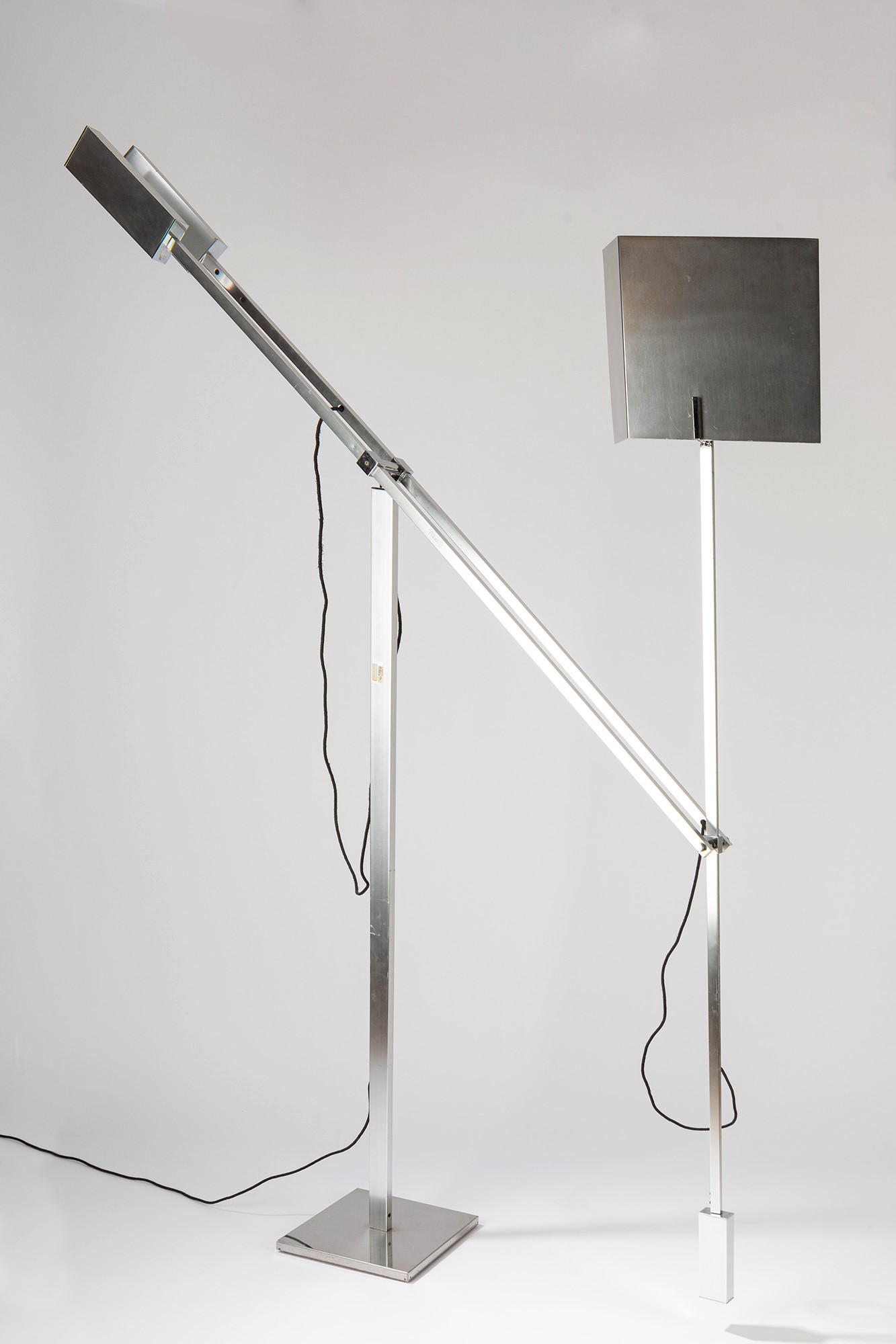 Angelo Brotto - Lampada da terralunghezza braccio alto 180 cm, lunghezza braccio intermedio 157 cm, altezza montante verticale 150 cm, base quadra 29 cm x 29 cm con struttura in acciaio cromato, paralume in alluminio satinato.