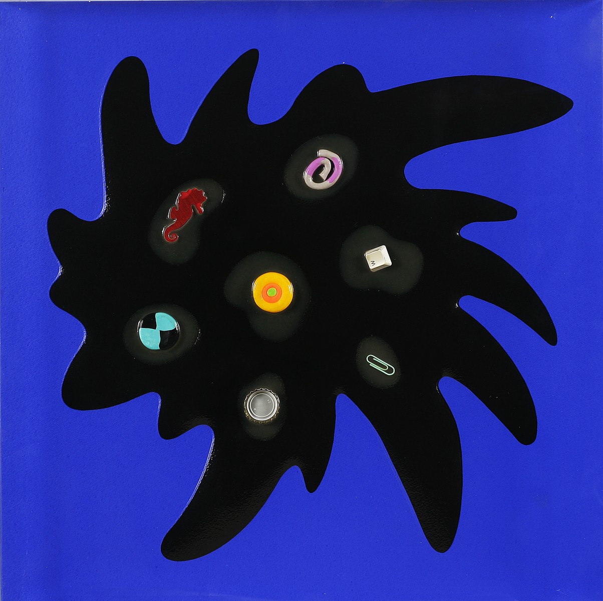 NUCARA RENZO (n. 1955) Farfalla di Nucara. 2012. Resine, oggetti, smalto, carta, legno. Cm 50,00 x 50,00 x 6,00. In teca di plexiglass. Opera archiviata presso l'archivio Renzo Nucara come da documentazione fotografica allegata riportante il relativo numero d'archivio; al retro numero d'archivio e firma.