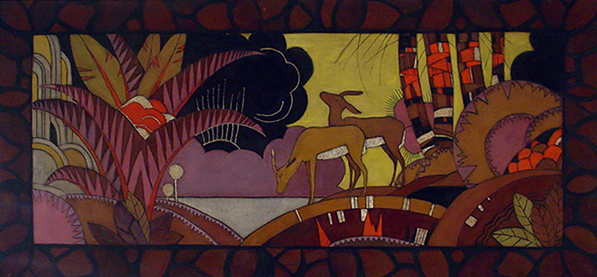 Francia - Olio su tela193 cm x h. 91 cm. raffigurante paesaggio di fantasia con cerbiatti. Non firmato.