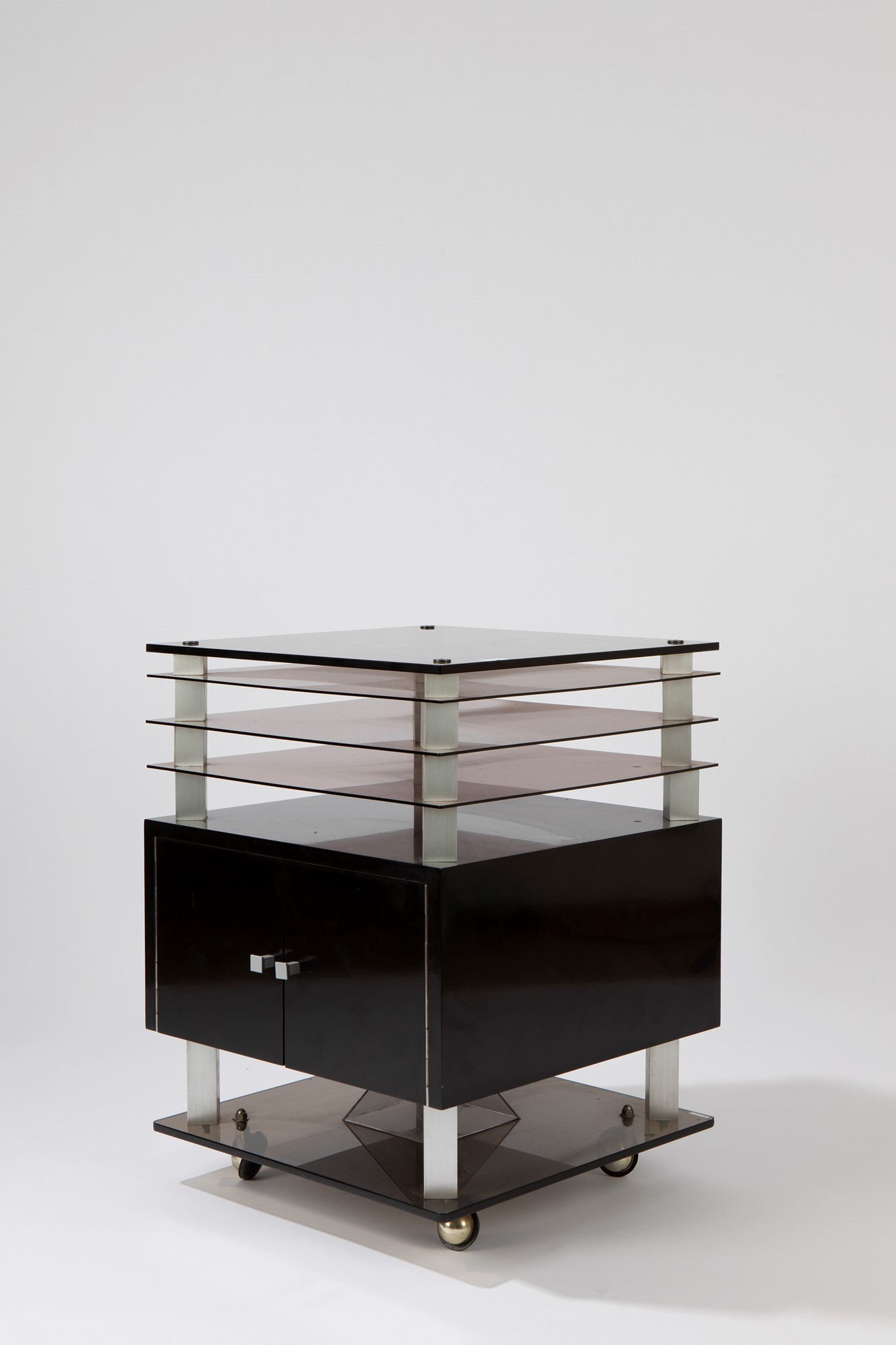 Manifattura Italiana - Comodinocm 65 x 48 razionalista in legno laccato, acciaio, plexiglass e vetro.