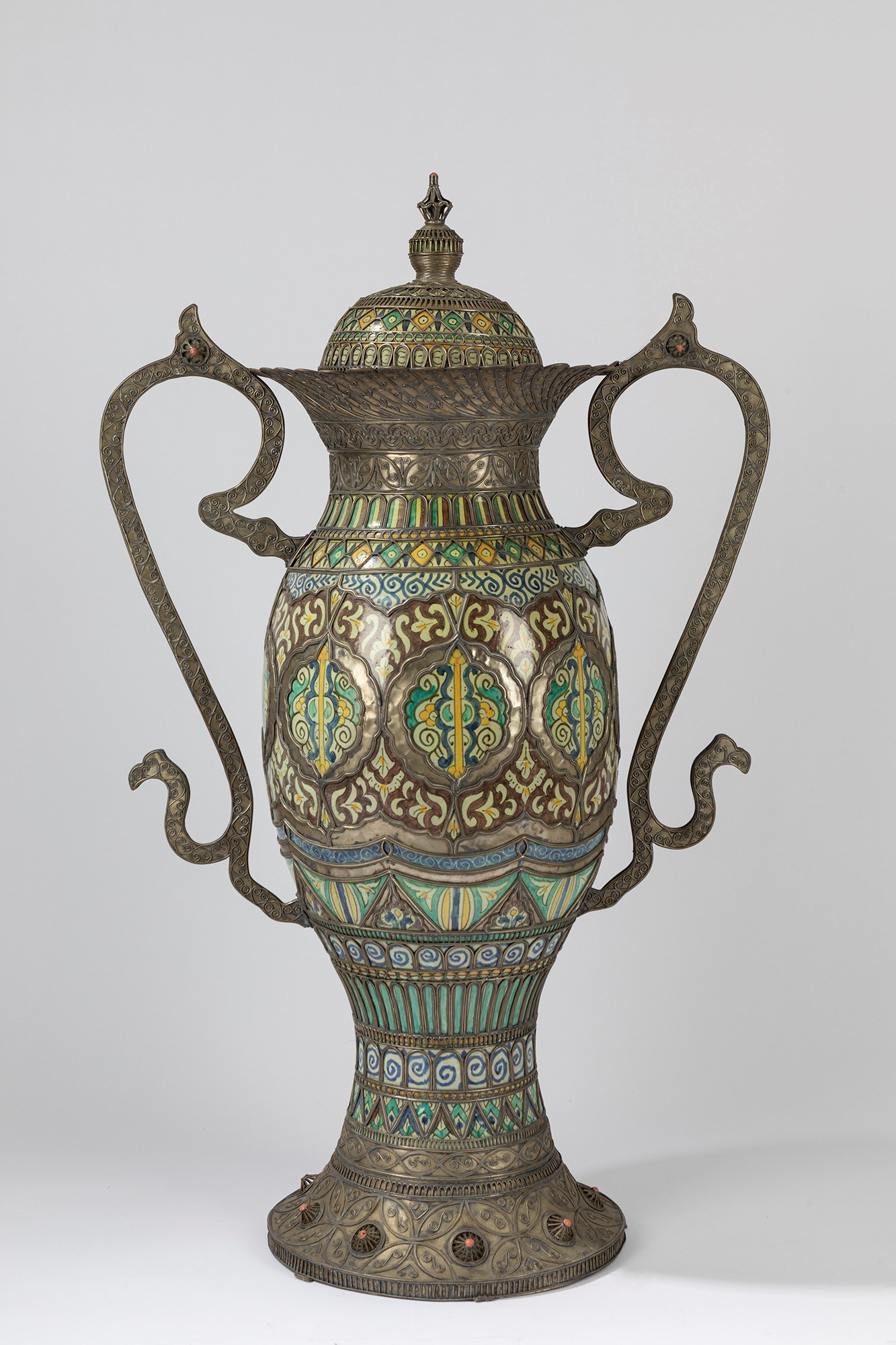 Manifattura marocchina - Vaso biansatocm h 121 x 75 in metallo e smalti.