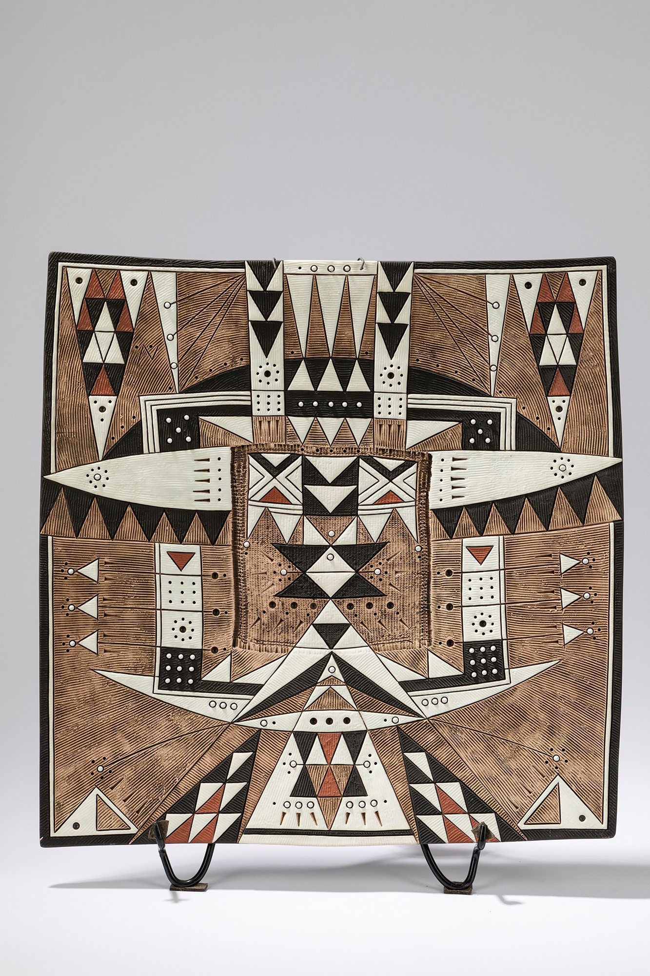Rodney Alan Blumenfeld, Sud Africa - Piatto decorativocm 51 x 51 quadrato in terracotta smaltata a decoro geometrico. Firmato e datato.