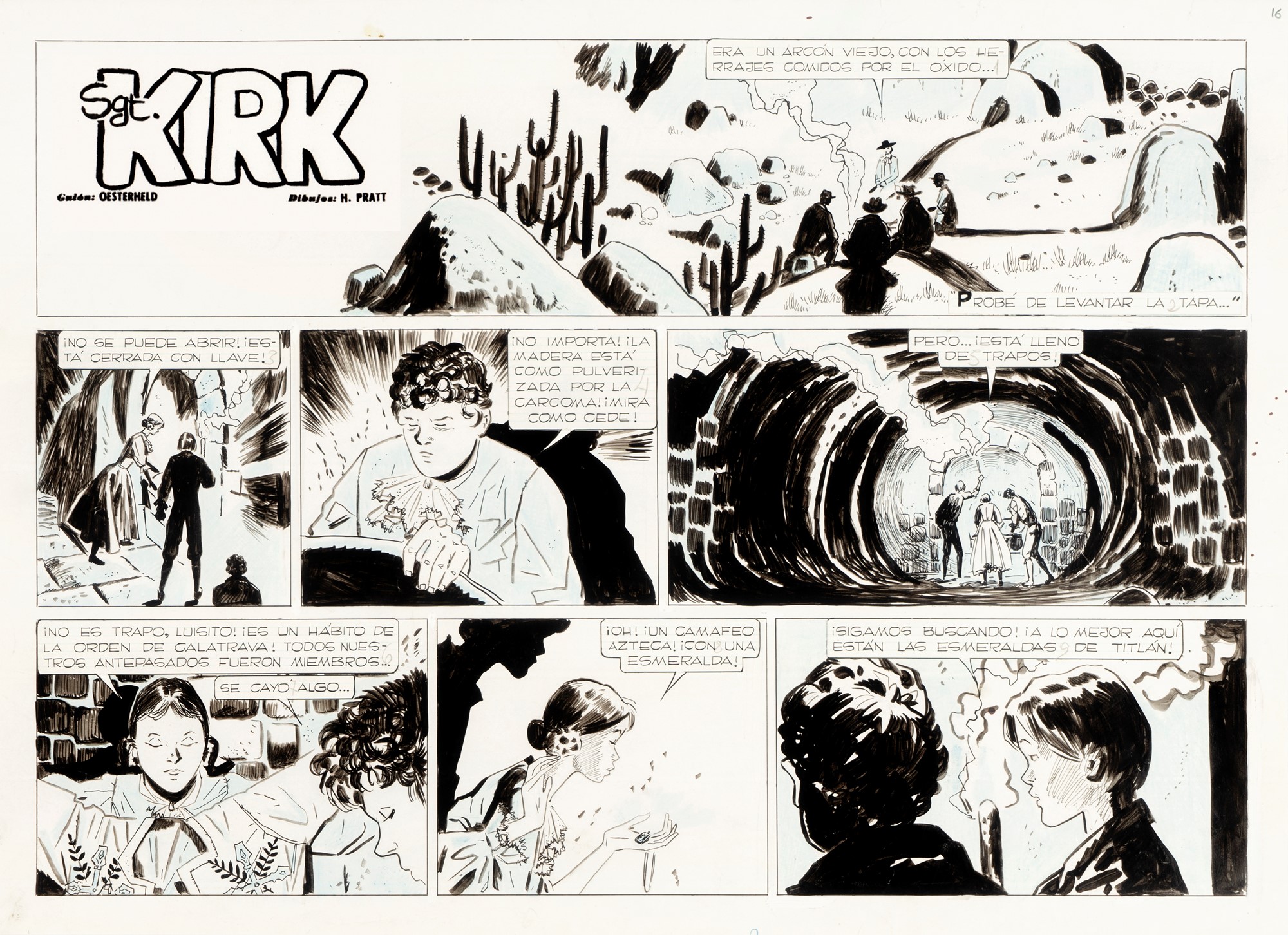 Tavola originale realizzata da Pratt per "Il castello di Titlàn", pag. 16 dell’ultima avventura de Il Sergente Kirk pubblicata per la prima volta in Argentina su Hora Cero Suplemento Semanal n. 69 dall’Editorial Frontera nel Dicembre 1958, ristampata in Italia nel volume "Il Sergente Kirk" dalla ANAFI nel 2008. Lievi pieghe e piccoli strappi al margine superiore. Titolo in fotocopia.