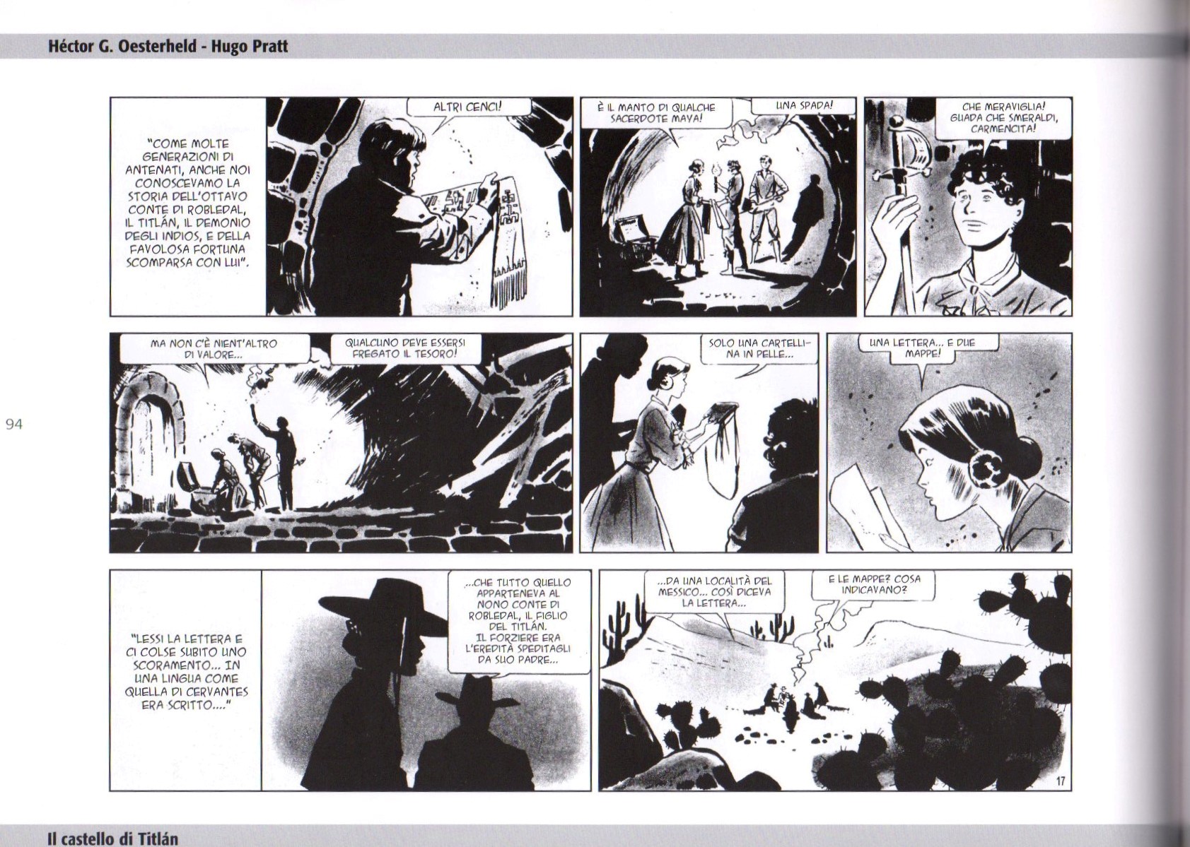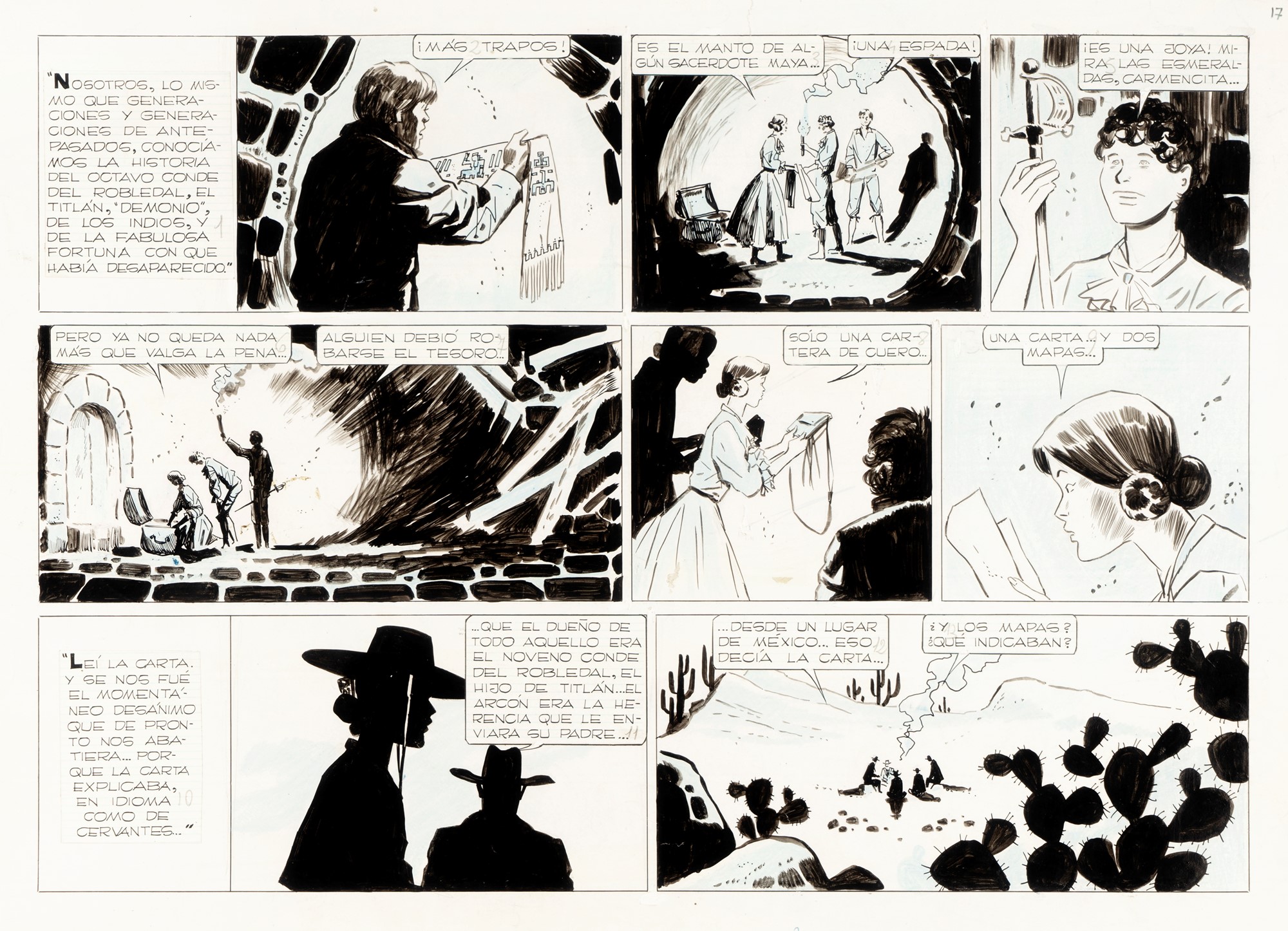 Tavola originale realizzata da Pratt per "Il castello di Titlàn", pag. 17 dell’ultima avventura de Il Sergente Kirk pubblicata per la prima volta in Argentina su Hora Cero Suplemento Semanal n. 69 dall’Editorial Frontera nel Dicembre 1958, ristampata in Italia nel volume "Il Sergente Kirk" dalla ANAFI nel 2008. Lievi pieghe e un piccolo strappo al margine superiore.