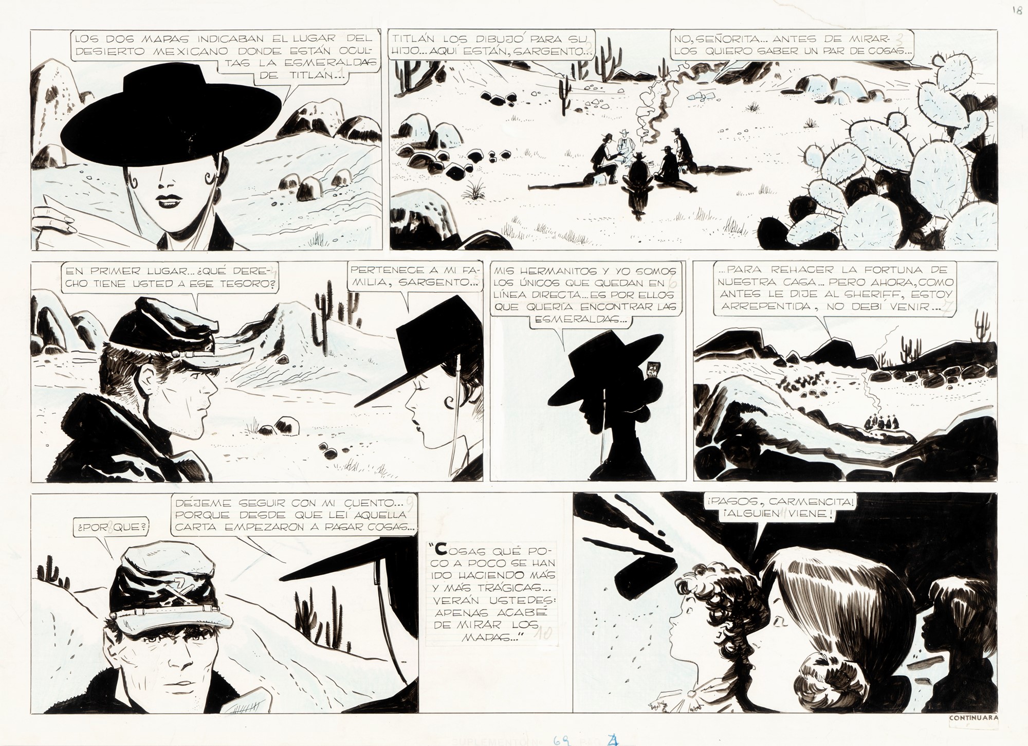 Tavola originale realizzata da Pratt per "Il castello di Titlàn", pag. 18 dell’ultima avventura de Il Sergente Kirk pubblicata per la prima volta in Argentina su Hora Cero Suplemento Semanal n. 69 dall’Editorial Frontera nel Dicembre 1958, ristampata in Italia nel volume "Il Sergente Kirk" dalla ANAFI nel 2008. Lievi pieghe e un piccolo strappo al margine superiore.