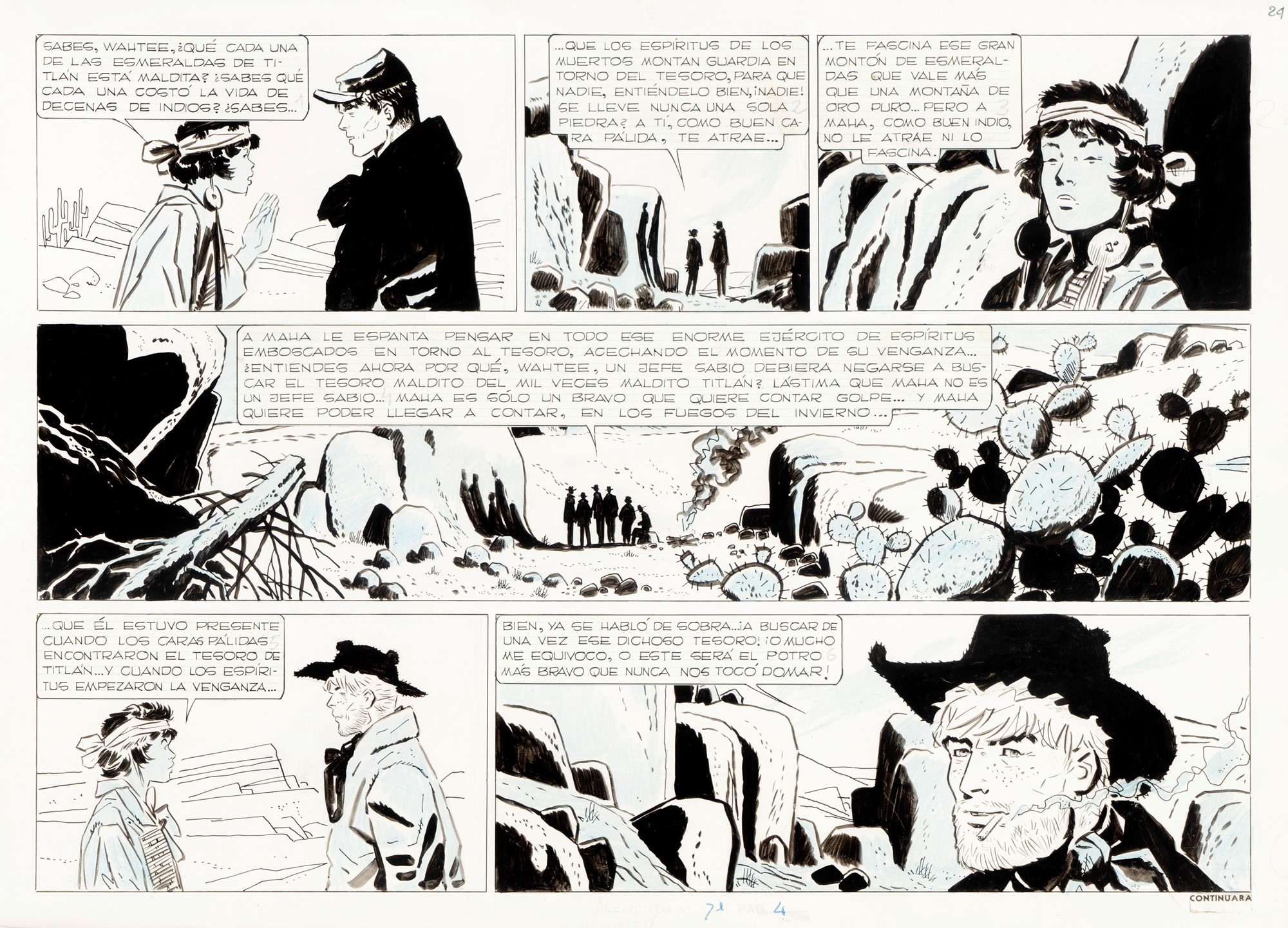 Tavola originale realizzata da Pratt per "Il castello di Titlàn", pag. 24 dell’ultima avventura de Il Sergente Kirk pubblicata per la prima volta in Argentina su Hora Cero Suplemento Semanal n. 71 dall’Editorial Frontera nel Gennaio 1959, ristampata in Italia nel volume "Il Sergente Kirk" dalla ANAFI nel 2008. Lievi pieghe e un piccolo strappo al margine inferiore.
