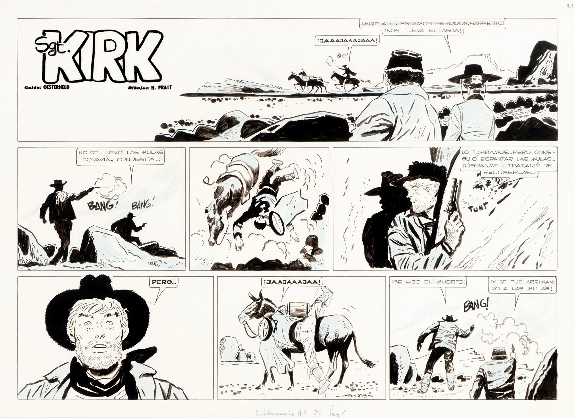 Tavola originale realizzata da Pratt per "Il castello di Titlàn", pag. 34 dell’ultima avventura de Il Sergente Kirk pubblicata per la prima volta in Argentina su Hora Cero Suplemento Semanal n. 75 dall’Editorial Frontera nel Febbraio 1959, ristampata in Italia nel volume "Il Sergente Kirk" dalla ANAFI nel 2008. Lievi pieghe e un piccolo strappo al margine inferiore. Titolo in fotocopia.