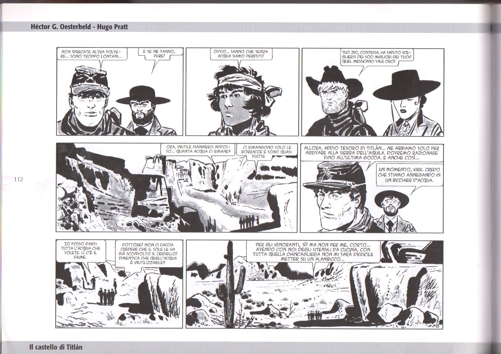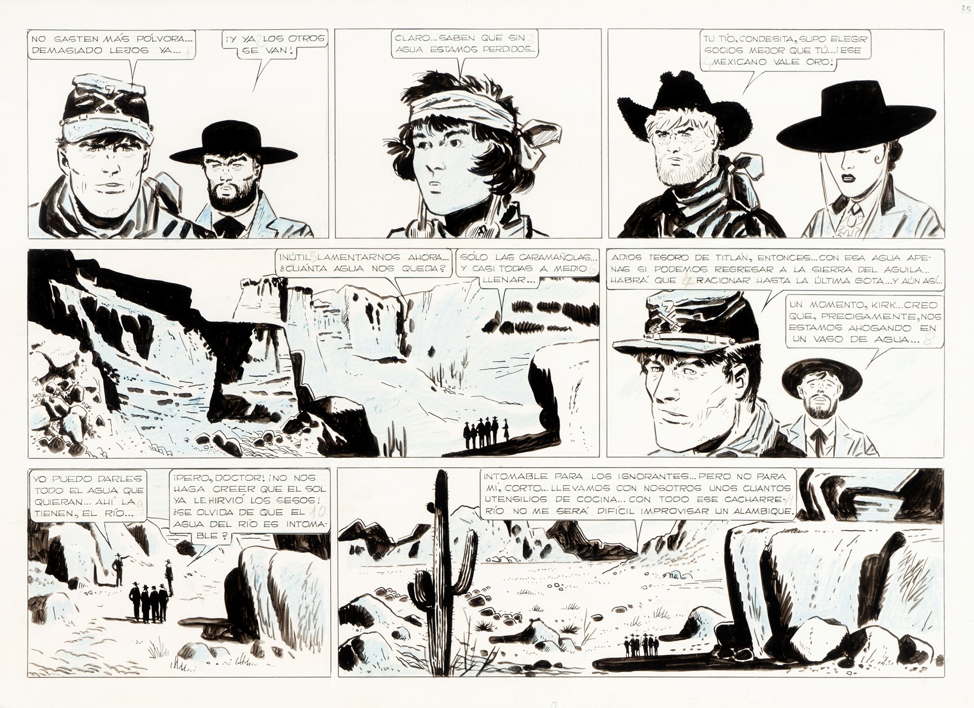 Tavola originale realizzata da Pratt per "Il castello di Titlàn", pag. 35 dell’ultima avventura de Il Sergente Kirk pubblicata per la prima volta in Argentina su Hora Cero Suplemento Semanal n. 75 dall’Editorial Frontera nel Febbraio 1959, ristampata in Italia nel volume "Il Sergente Kirk" dalla ANAFI nel 2008. Lievi pieghe.