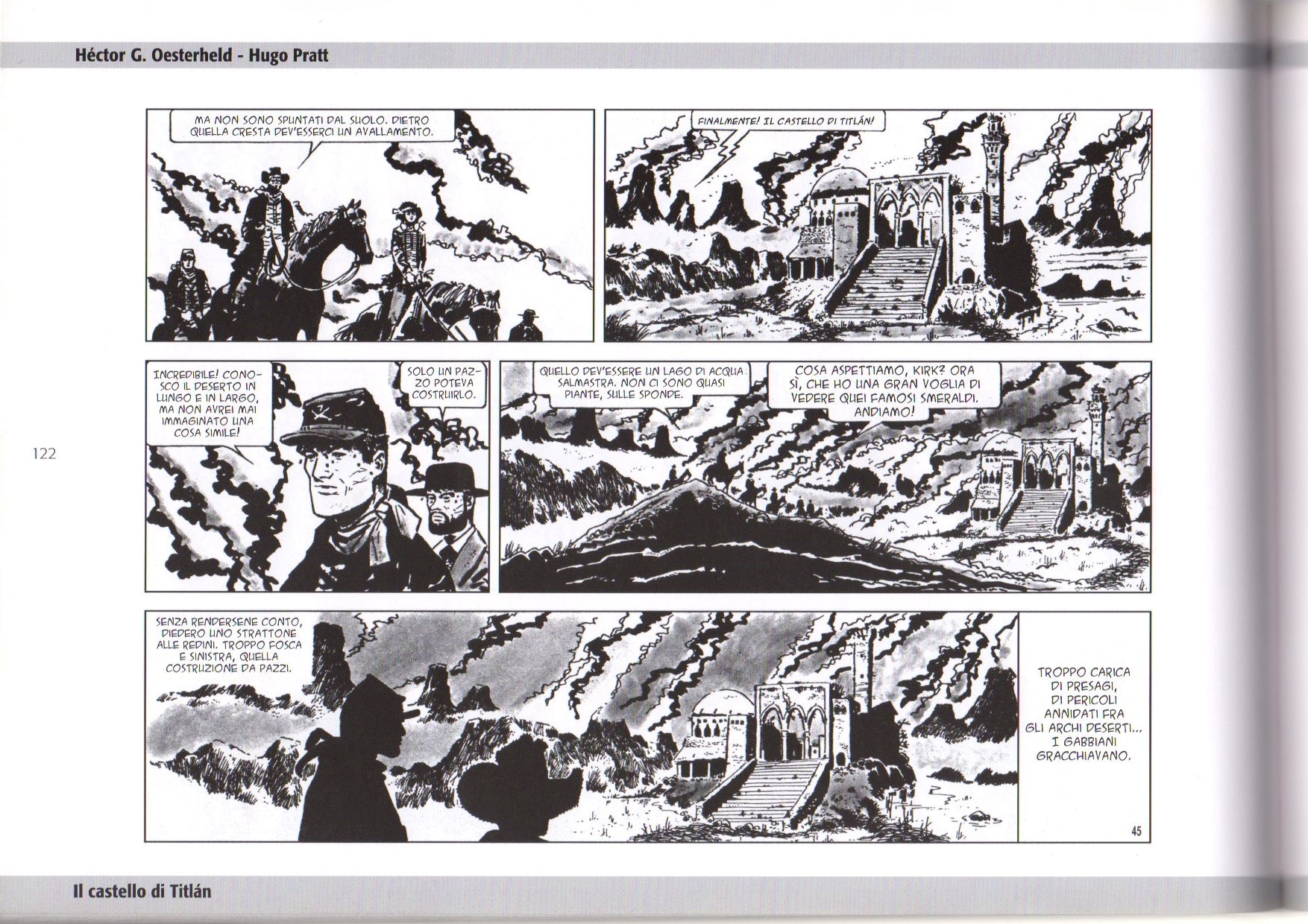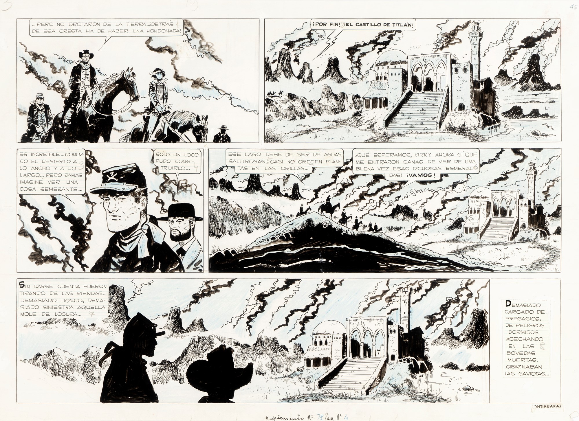 Tavola originale realizzata da Pratt per "Il castello di Titlàn", pag. 45 dell’ultima avventura de Il Sergente Kirk pubblicata per la prima volta in Argentina su Hora Cero Suplemento Semanal n. 78 dall’Editorial Frontera nel Febbraio 1959, ristampata in Italia nel volume "Il Sergente Kirk" dalla ANAFI nel 2008. Lievi pieghe e piccoli strappi ai margini.