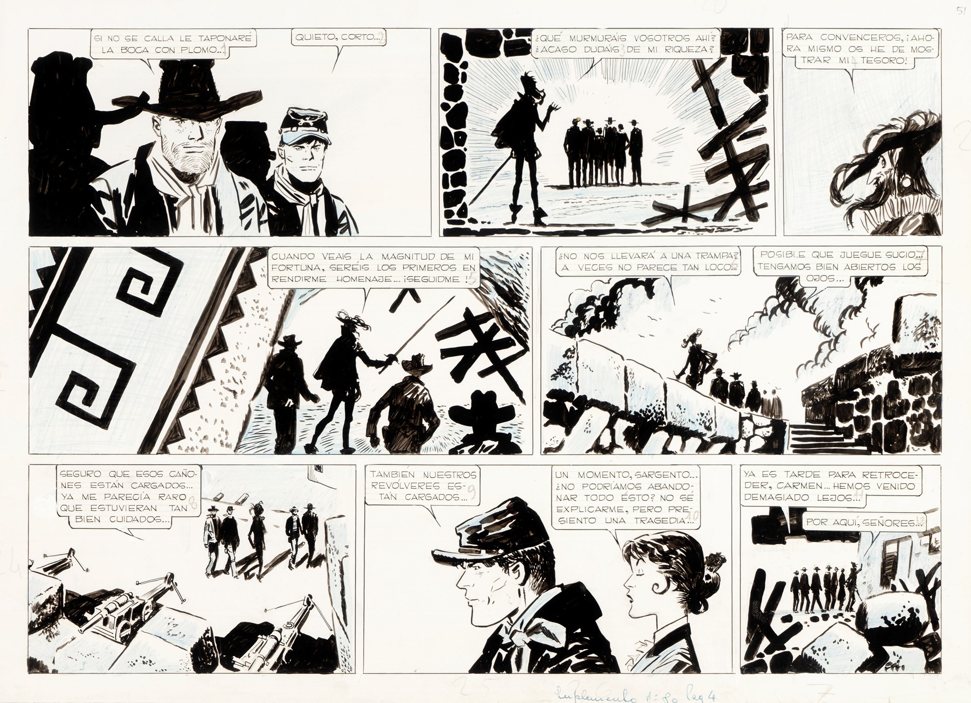 Tavola originale realizzata da Pratt per "Il castello di Titlàn", pag. 51 dell’ultima avventura de Il Sergente Kirk pubblicata per la prima volta in Argentina su Hora Cero Suplemento Semanal n. 80 dall’Editorial Frontera nel Marzo 1959, ristampata in Italia nel volume "Il Sergente Kirk" dalla ANAFI nel 2008. Lievi pieghe e piccoli strappi al margine inferiore.