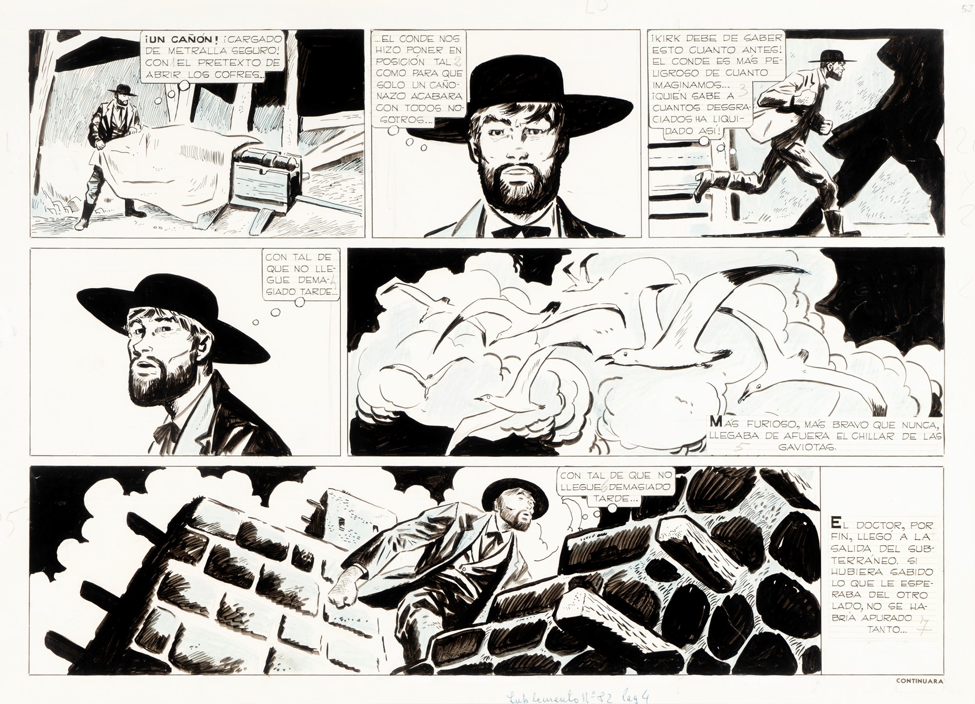 Tavola originale realizzata da Pratt per "Il castello di Titlàn", pag. 57 dell’ultima avventura de Il Sergente Kirk pubblicata per la prima volta in Argentina su Hora Cero Suplemento Semanal n. 82 dall’Editorial Frontera nel Marzo 1959, ristampata in Italia nel volume "Il Sergente Kirk" dalla ANAFI nel 2008. Lievi pieghe.