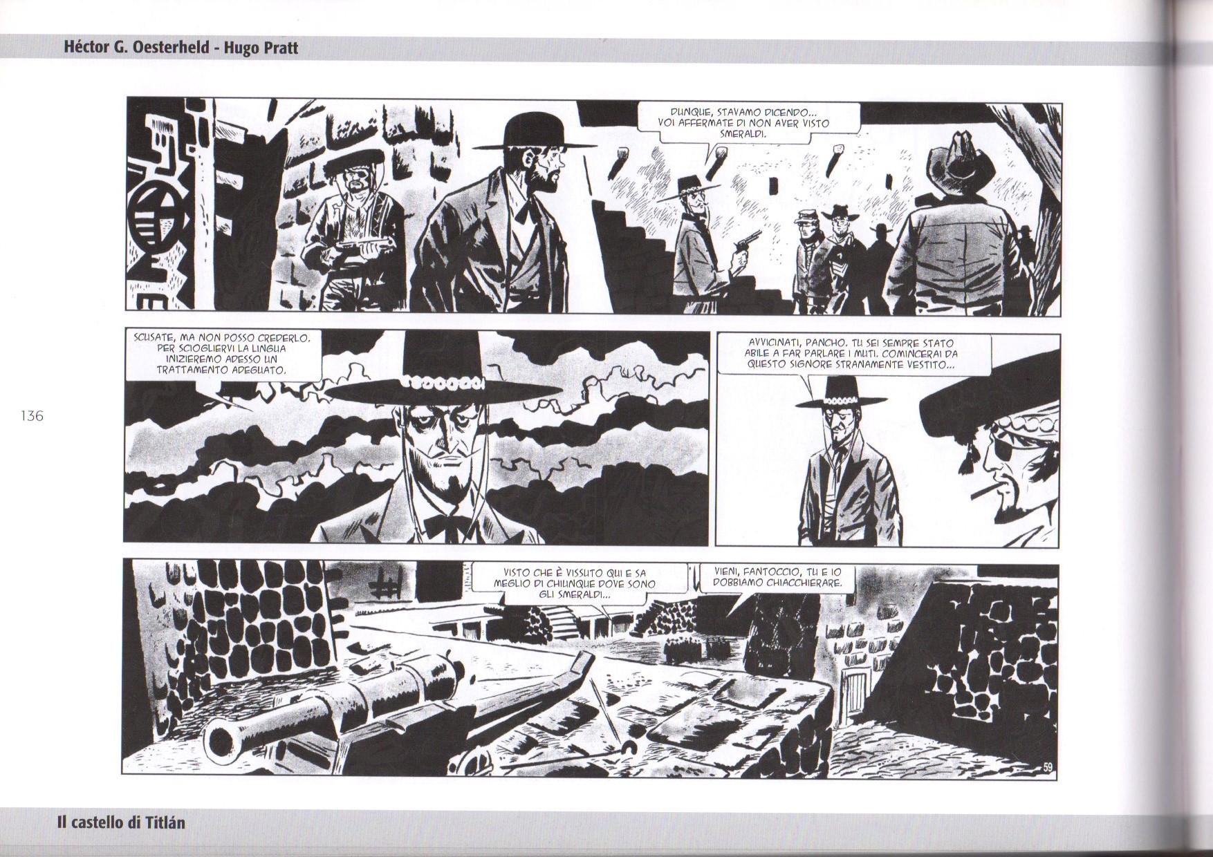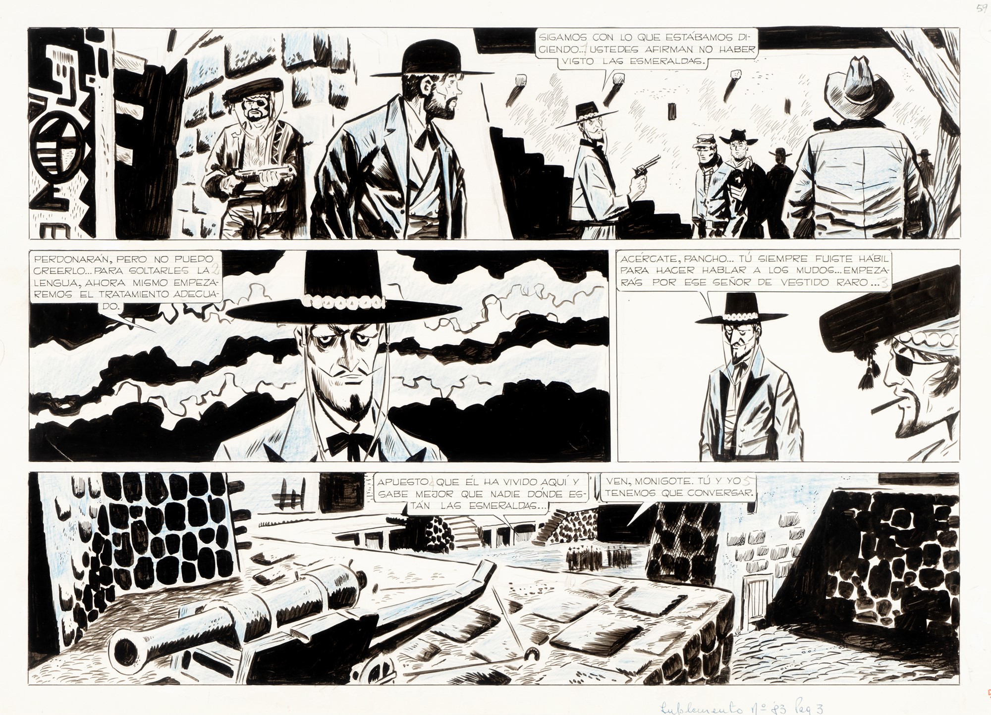 Tavola originale realizzata da Pratt per "Il castello di Titlàn", pag. 59 dell’ultima avventura de Il Sergente Kirk pubblicata per la prima volta in Argentina su Hora Cero Suplemento Semanal n. 83 dall’Editorial Frontera nell'Aprile 1959, ristampata in Italia nel volume "Il Sergente Kirk" dalla ANAFI nel 2008. Lievi pieghe.