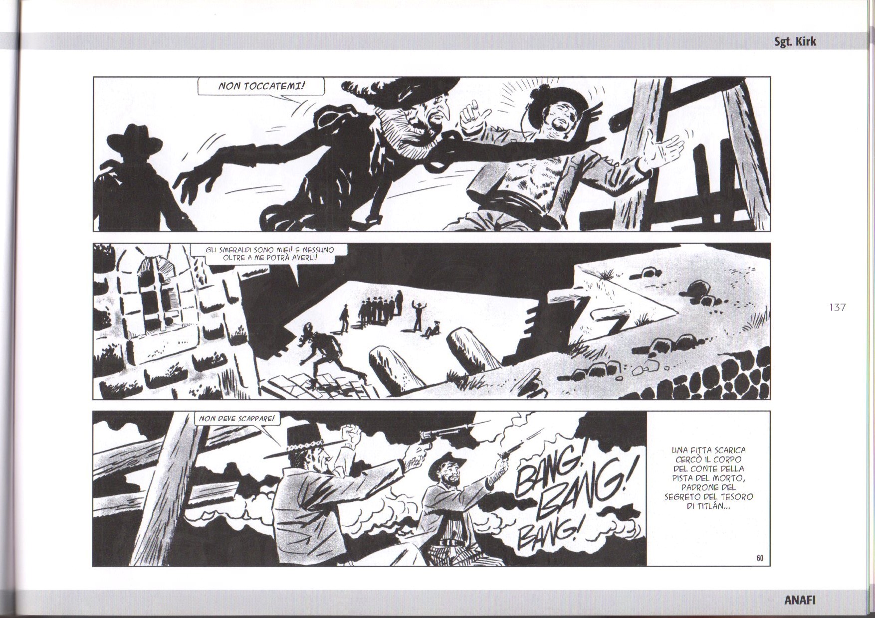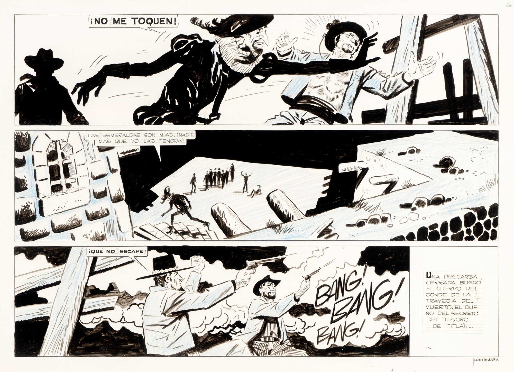 Tavola originale realizzata da Pratt per "Il castello di Titlàn", pag. 60 dell’ultima avventura de Il Sergente Kirk pubblicata per la prima volta in Argentina su Hora Cero Suplemento Semanal n. 83 dall’Editorial Frontera nell'Aprile 1959, ristampata in Italia nel volume "Il Sergente Kirk" dalla ANAFI nel 2008. Lievi pieghe e un piccolo strappo al margine superiore.